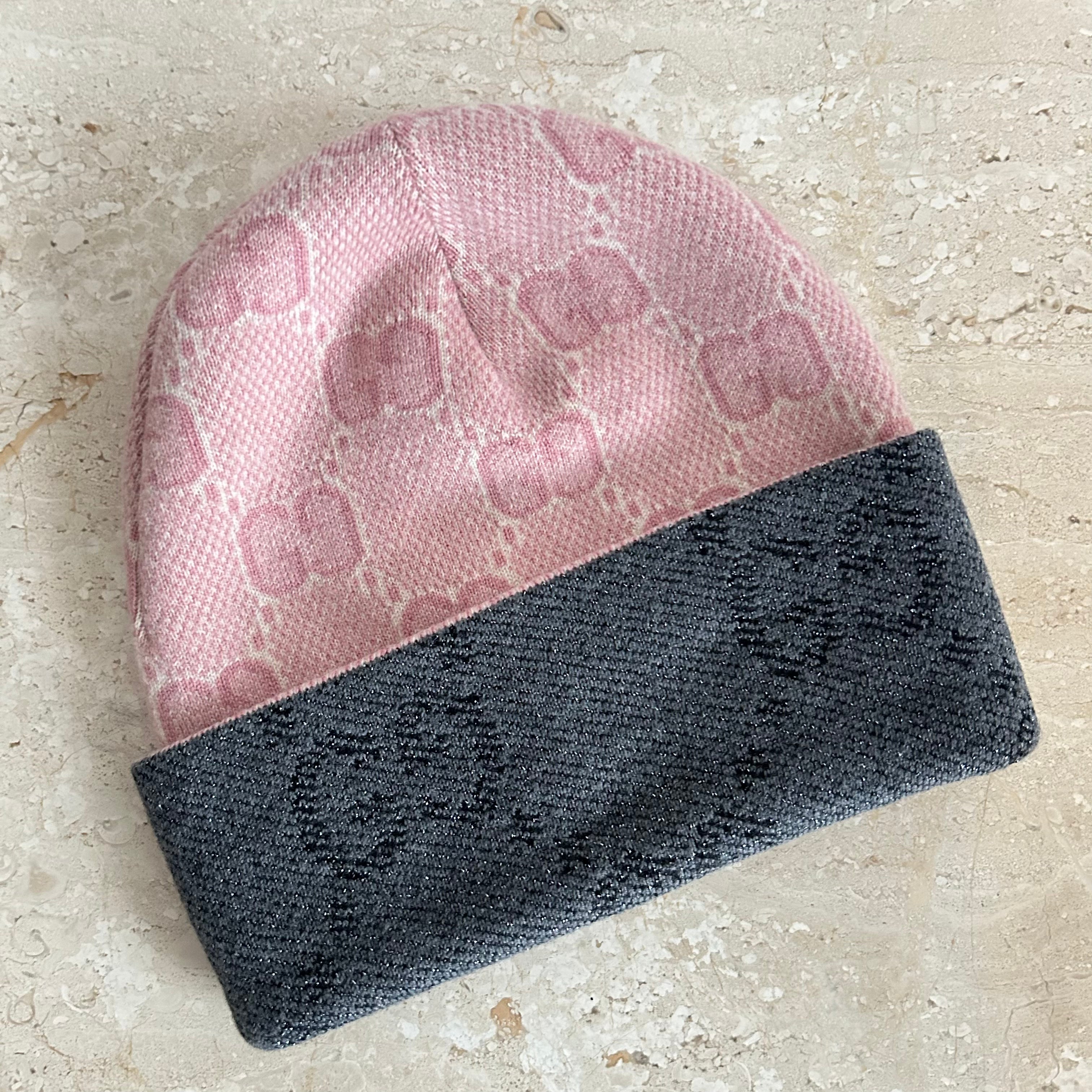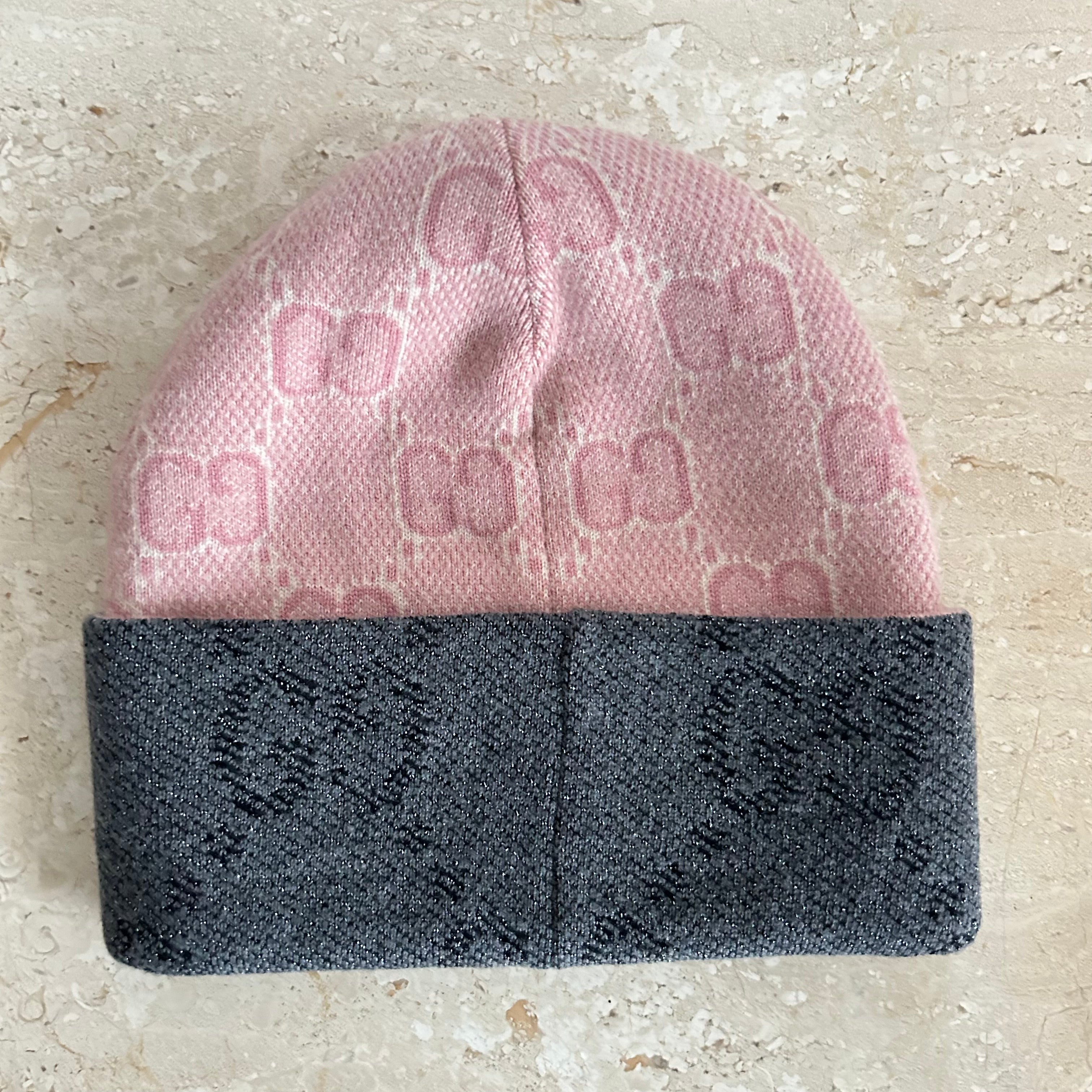 Pre-Owned Gucci Graphite/Pink Wool Beanie Hat. Made in 100% wool, this knit beanie features the interlocking GG in pink and white on the exterior, and the interlocking GG in sparkling grey on the interior. A fab Find and a great gift!