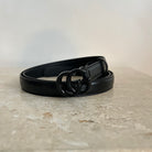 Pre-Owned Gucci Marmont Thin Black Belt Size 105/30. This black leather belt features the iconic interlocking GG logo in black brass hardware with ceramic effect finishing. A great find!