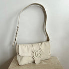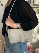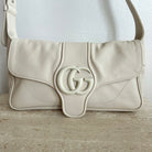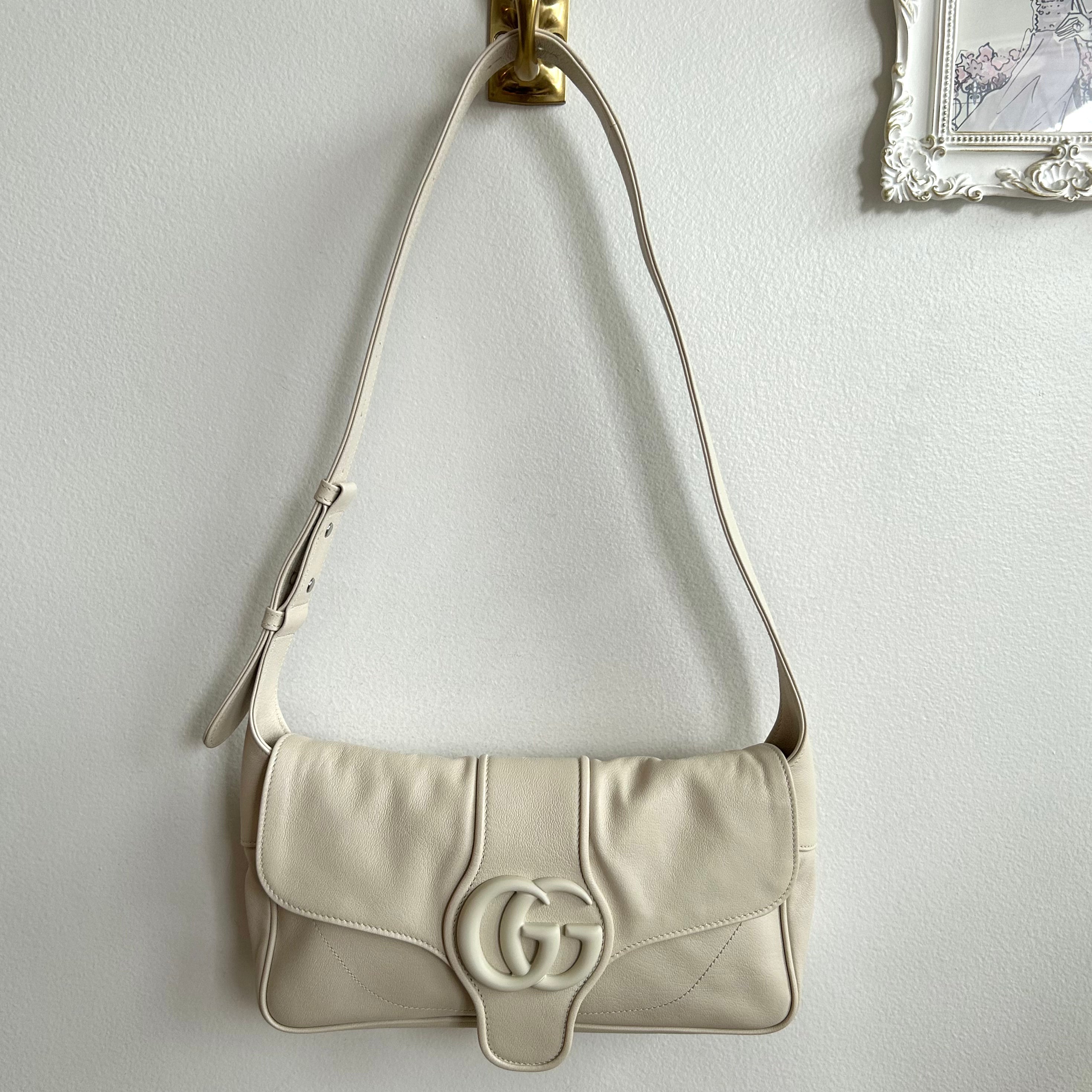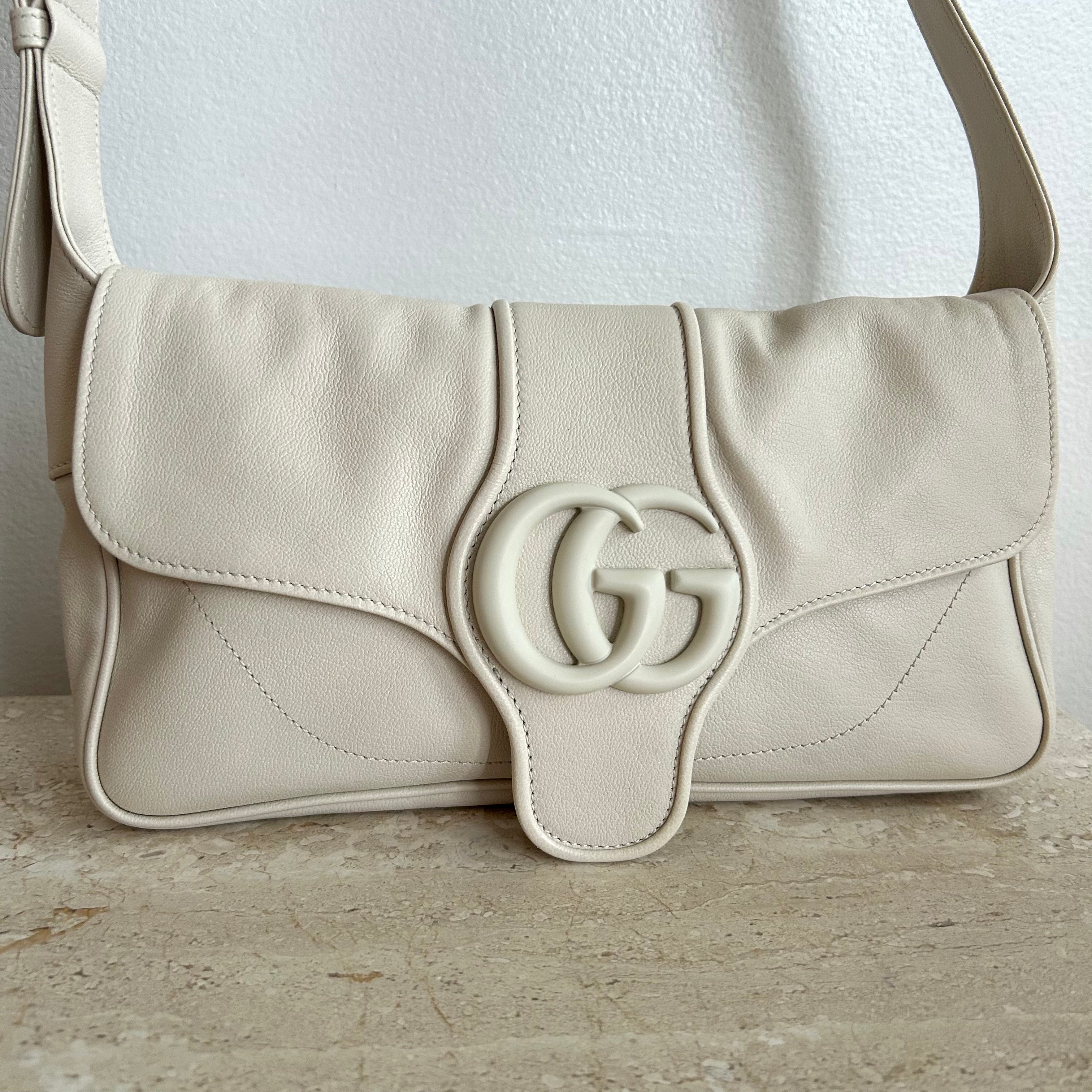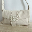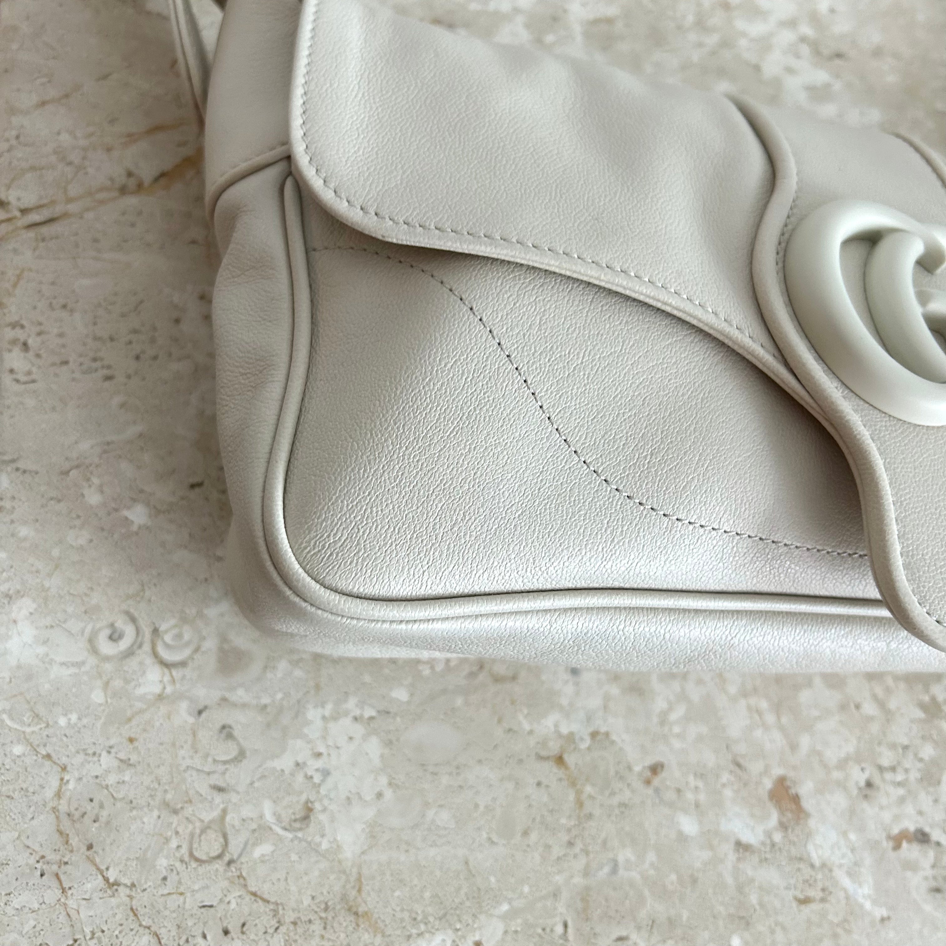 Pre-Owned Gucci Small Aphrodite Soft Shoulder Bag. Made in soft goatskin leather in the colour mystic white, this shoulder bag features the double GG logo on the front in matching enamel. Adjustable shoulder strap. Front flap opens to a microfibre lined interior hosting a zip pocket. The perfect slouchy shoulder bag!