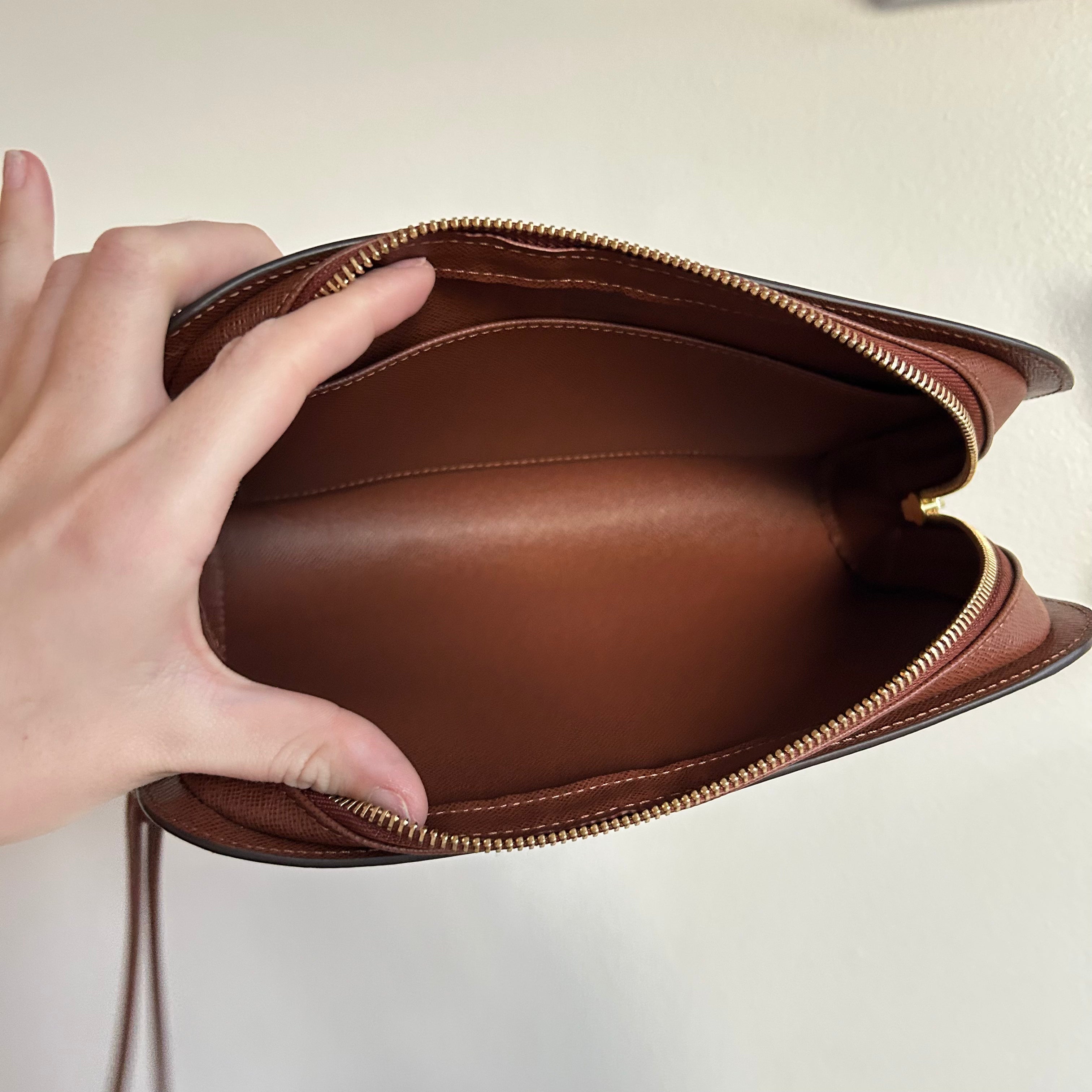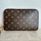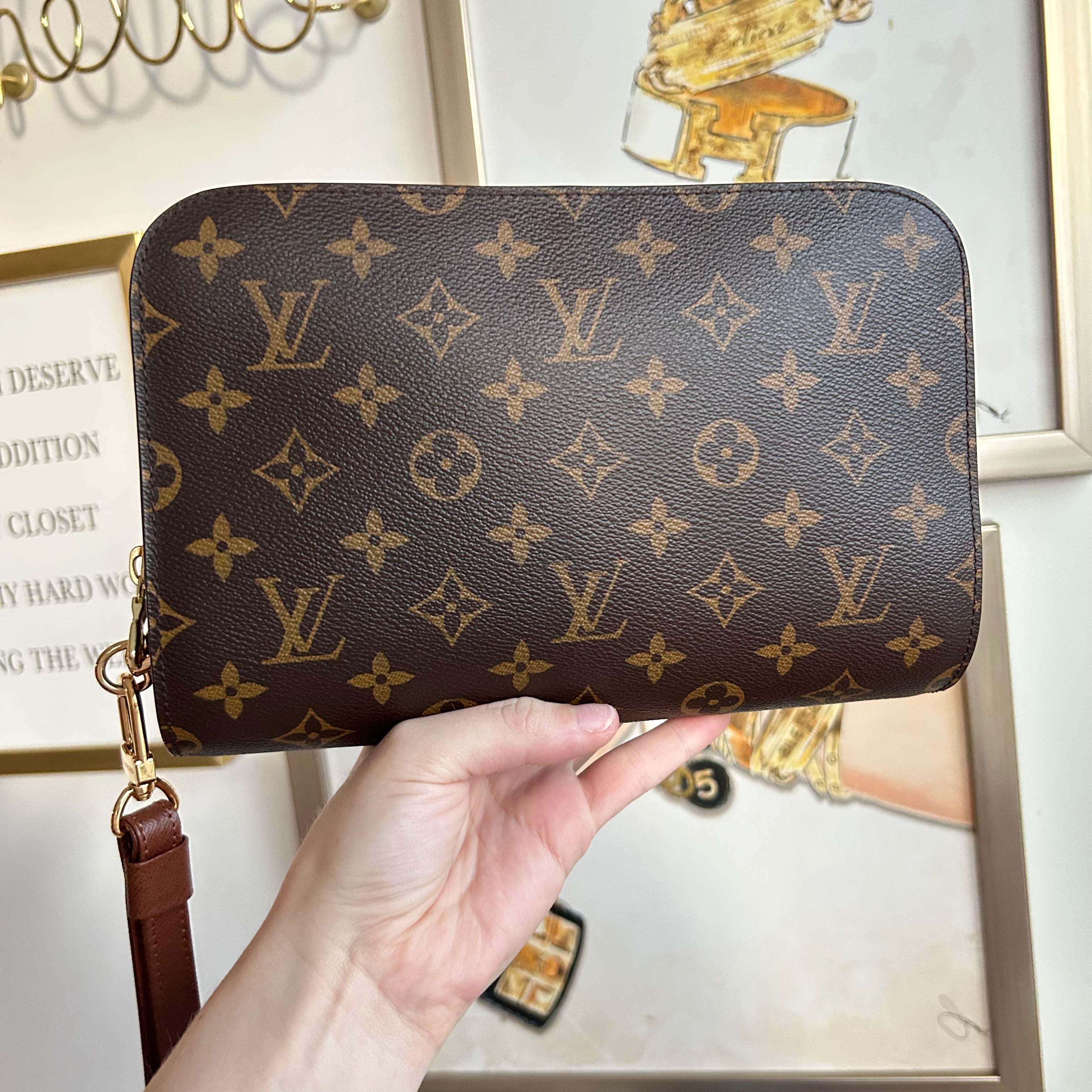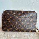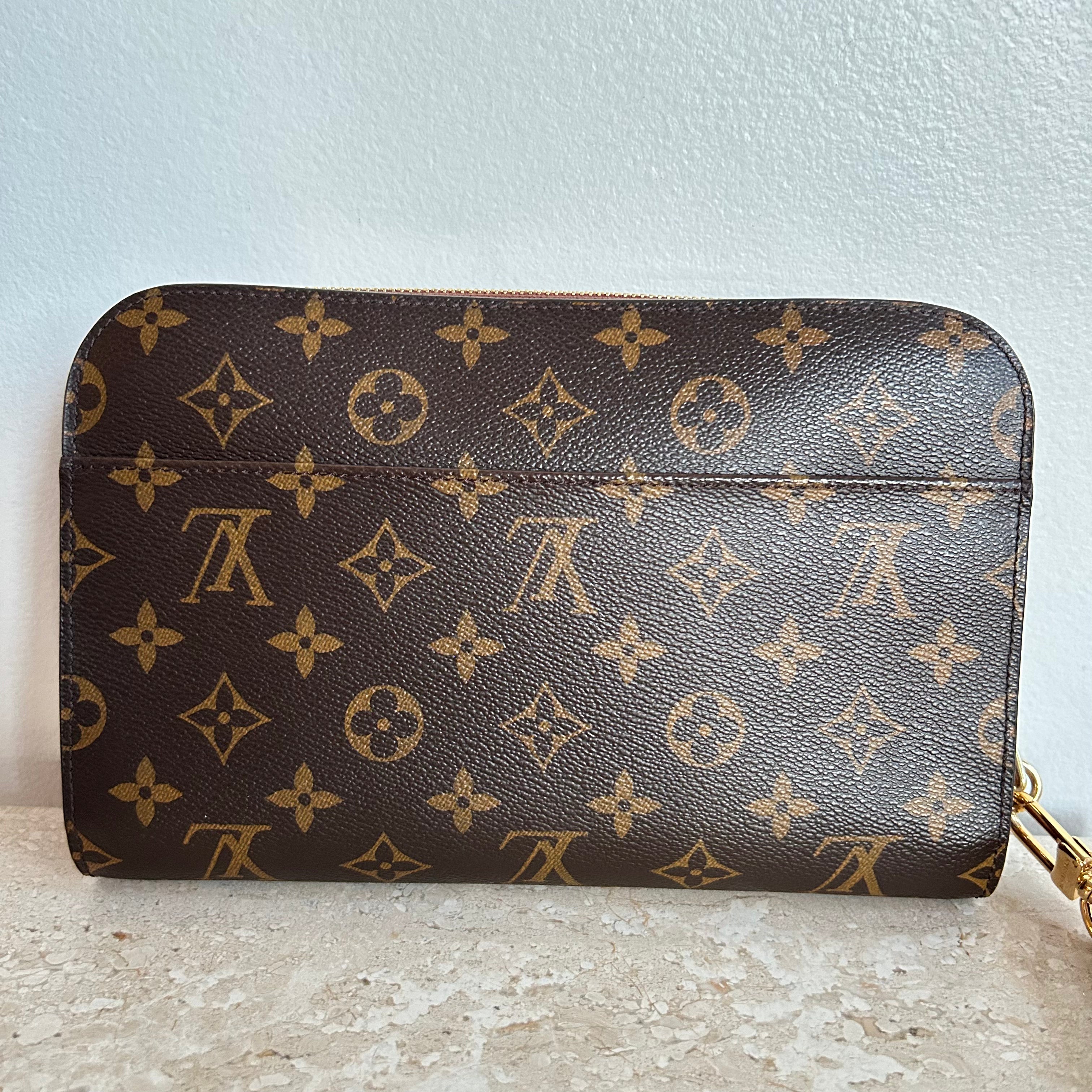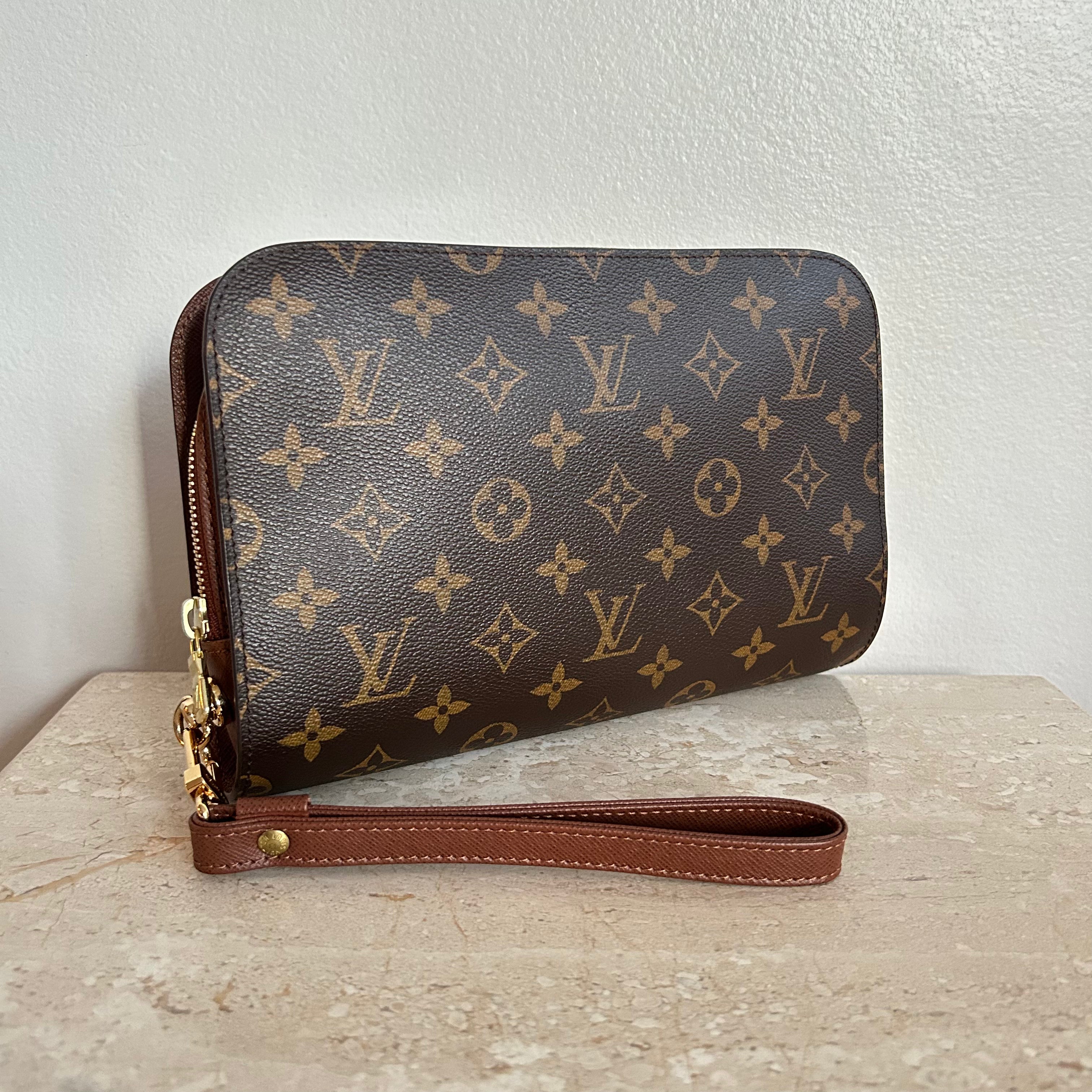 Pre-Owned Louis Vuitton Monogram Orsay Clutch. Classic monogram canvas with a top zip closure and removable wristlet. The interior features one slit pocket and is large enough to hold a phone and essentials. Back slip pocket (interior lining starting to bubble). This unisex discontinued bag is a great vintage find!