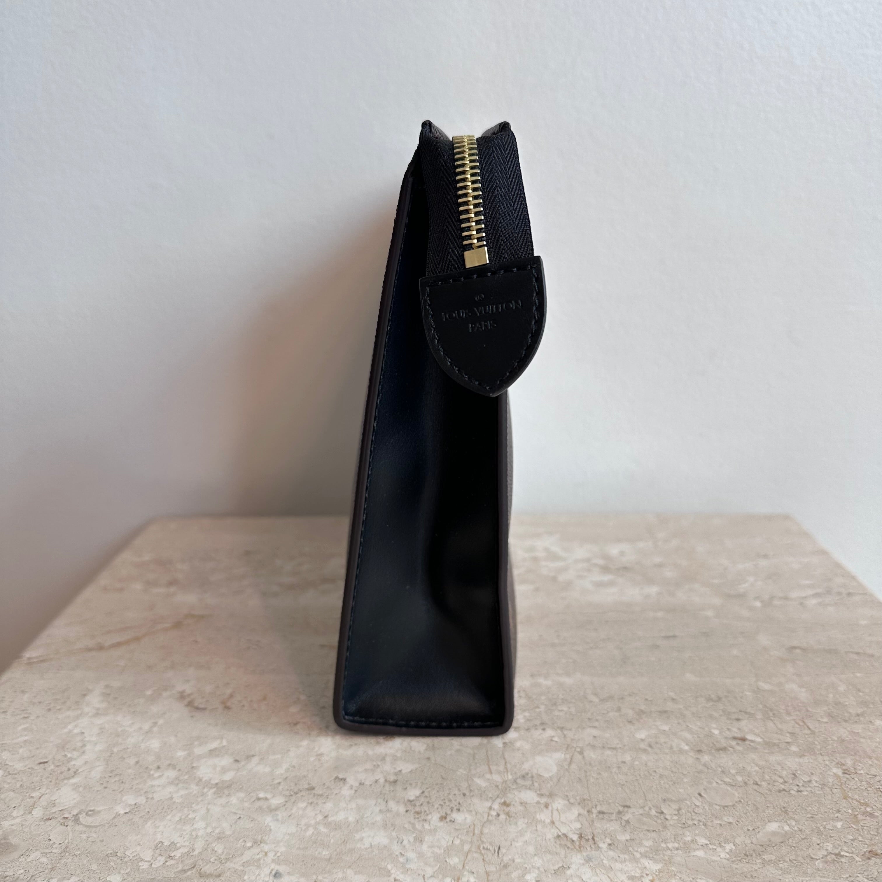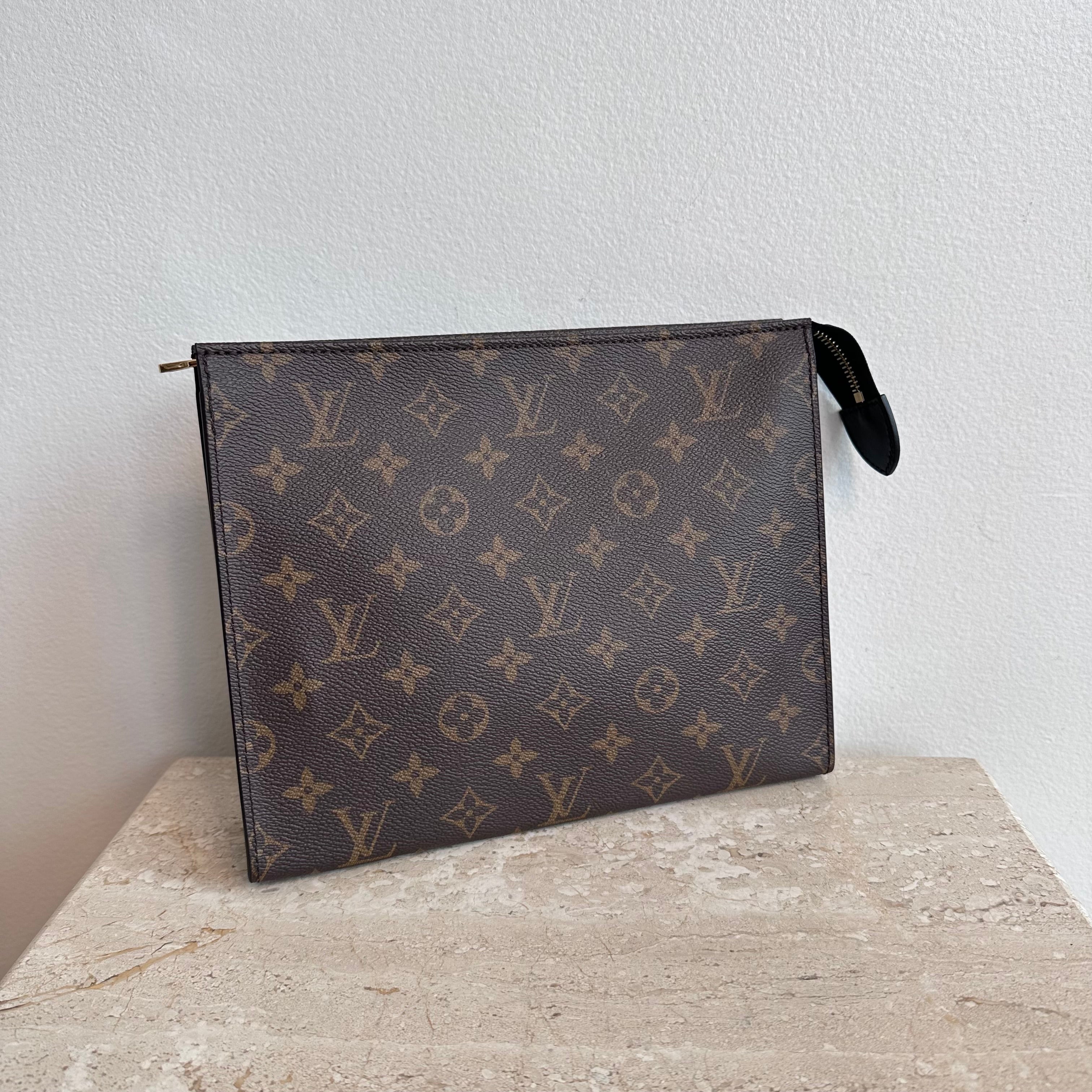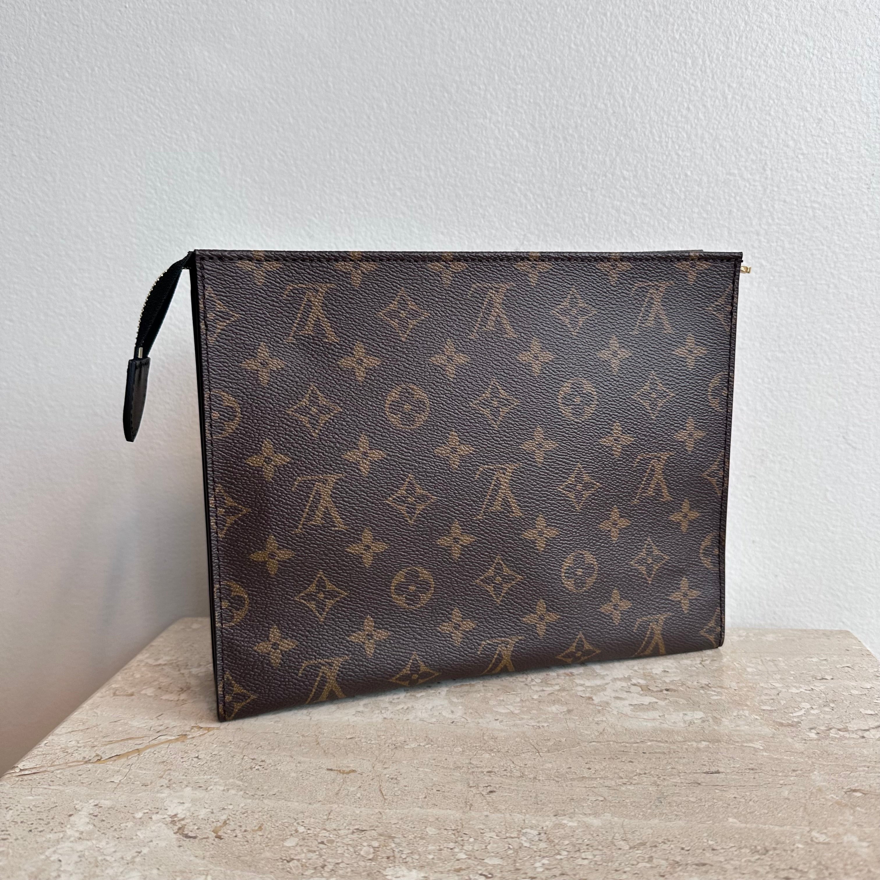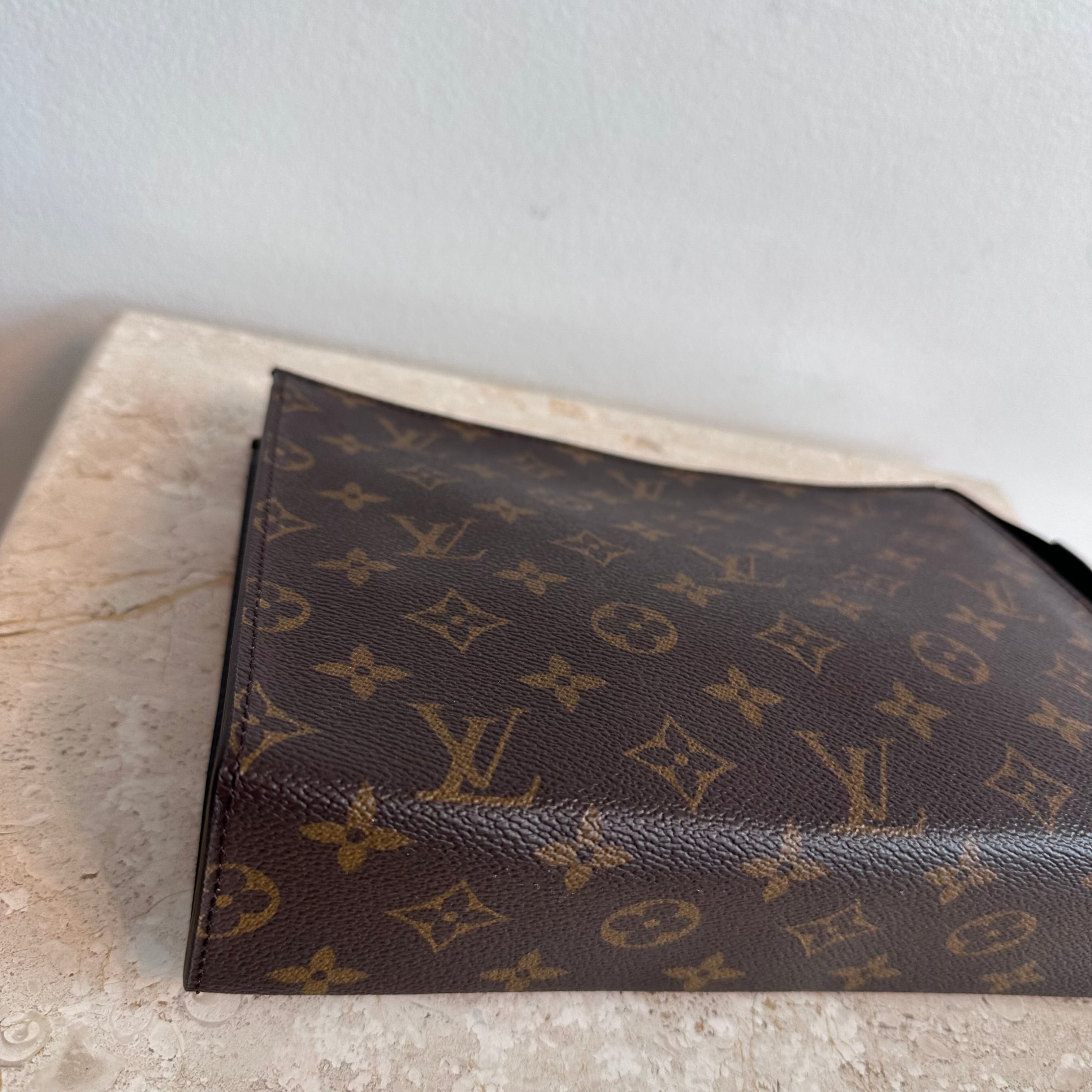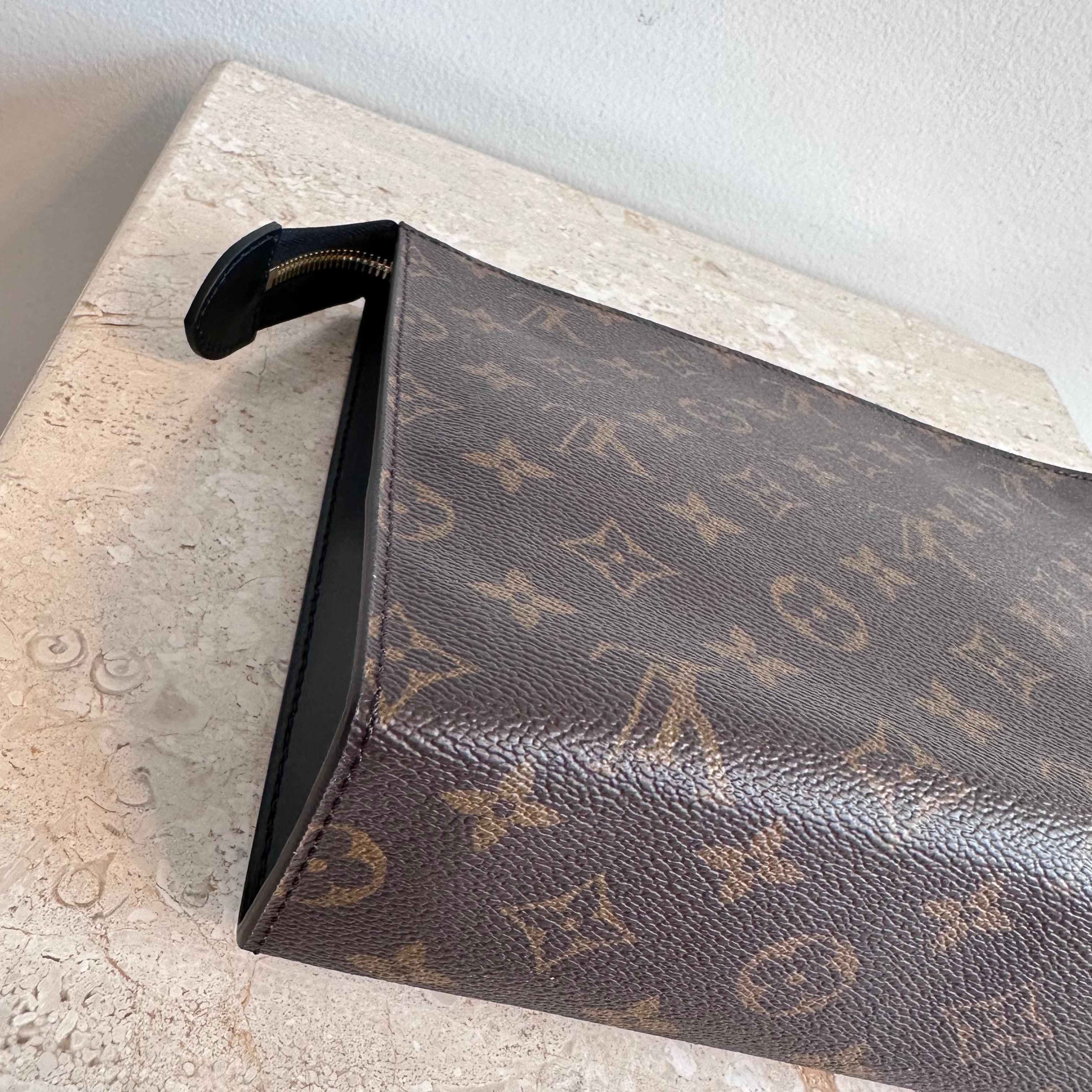 Pre-Owned Louis Vuitton Monogram Poche Toilette NM. Crafted in monogram canvas with a fine black cowhide interior and a gold-tone zipper closure. The interior design incorporates four card slots and a patch pocket for papers. A convenient and stylish way to carry necessities!