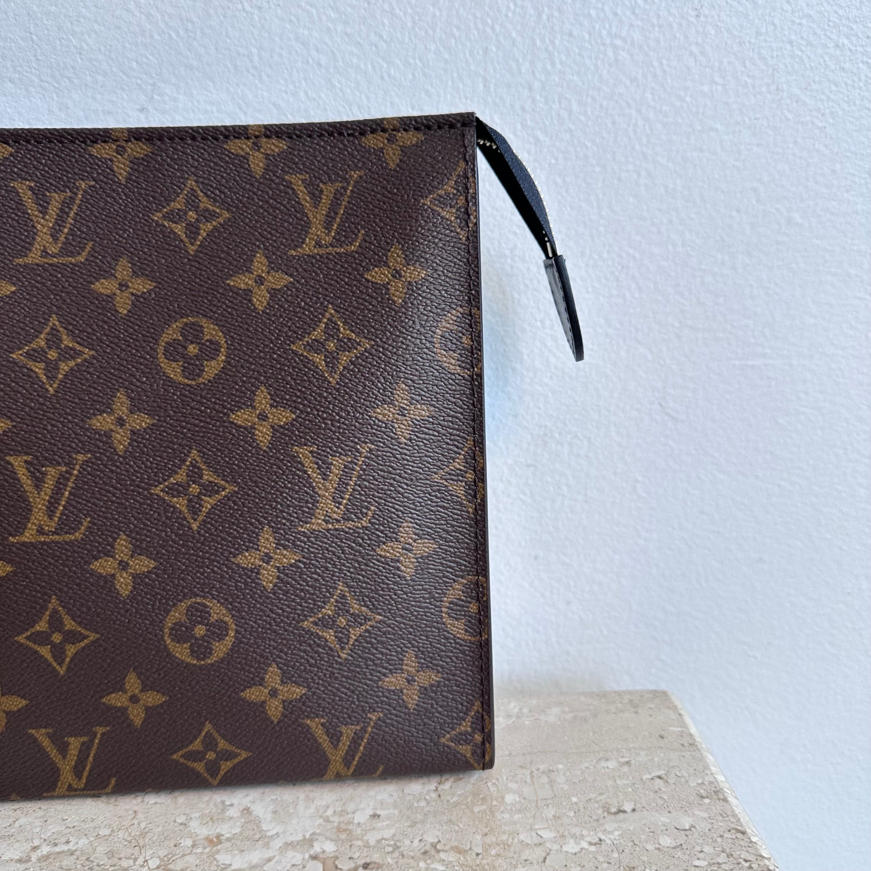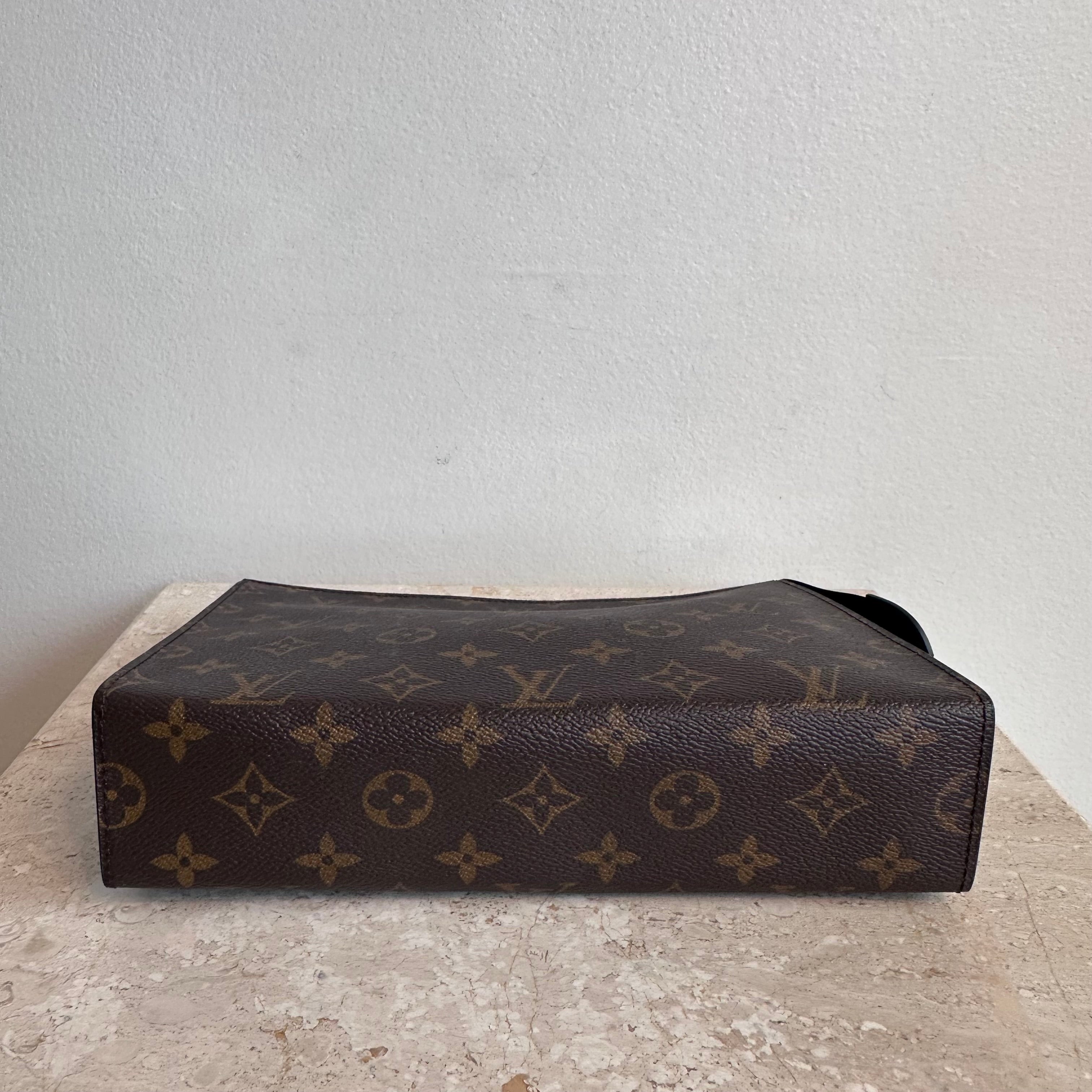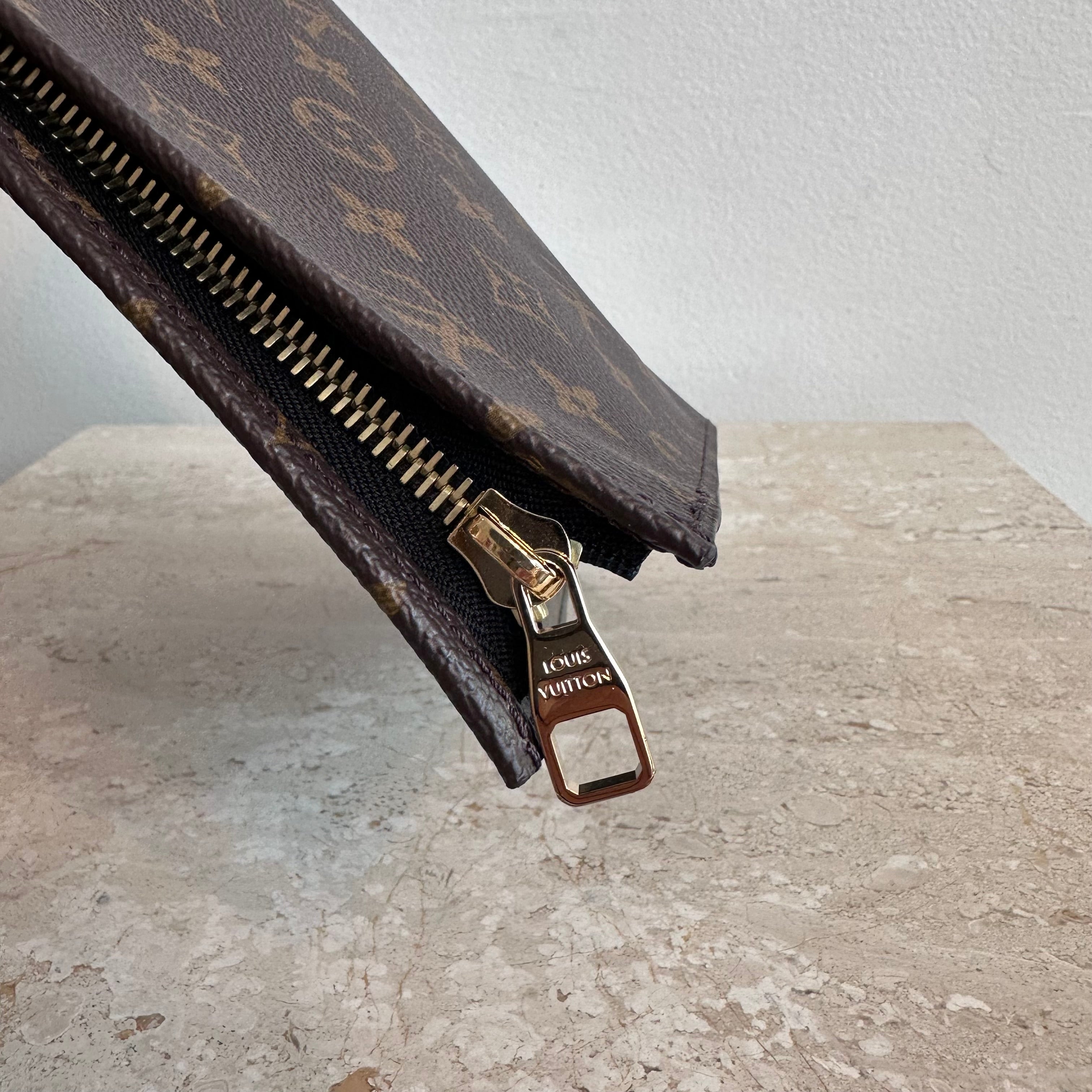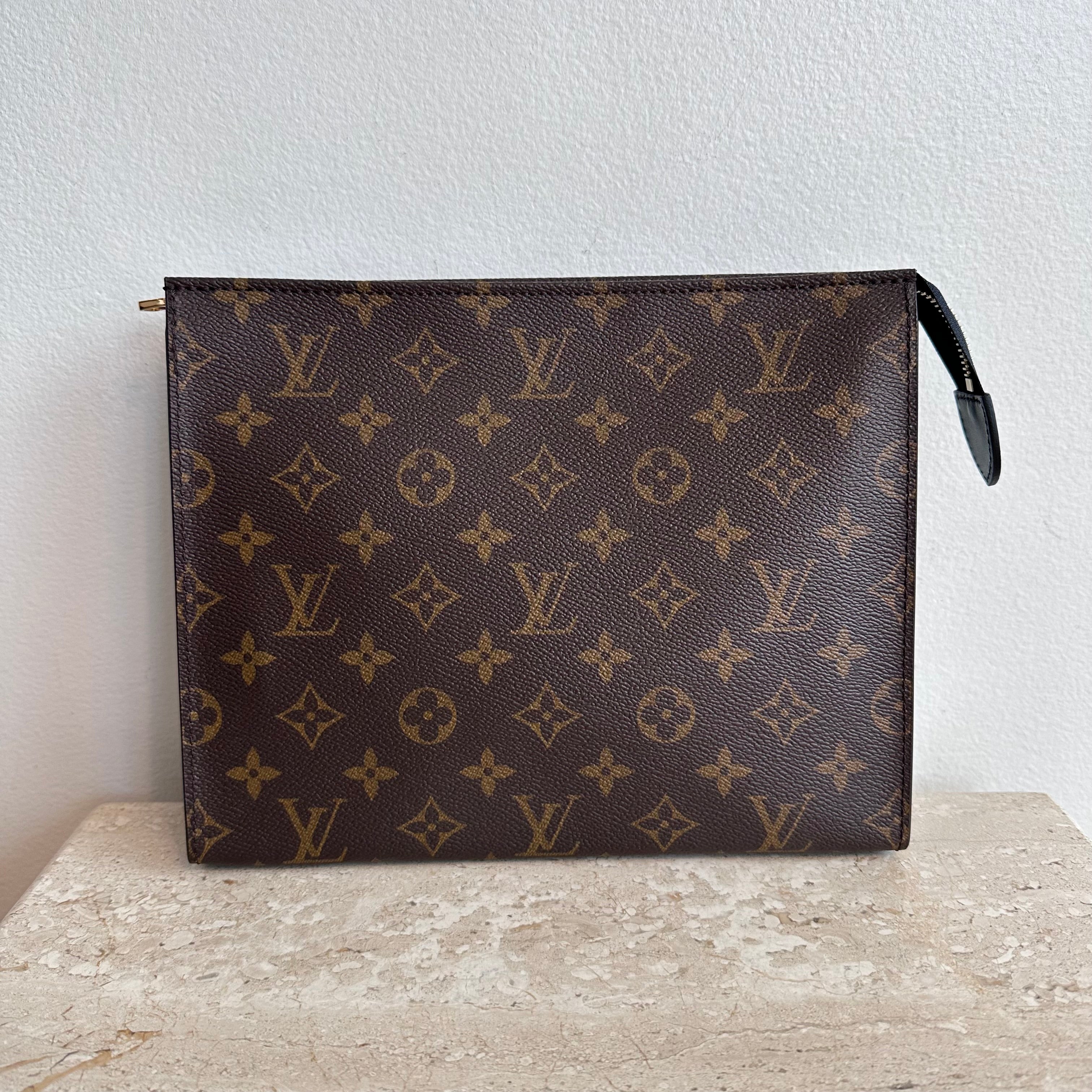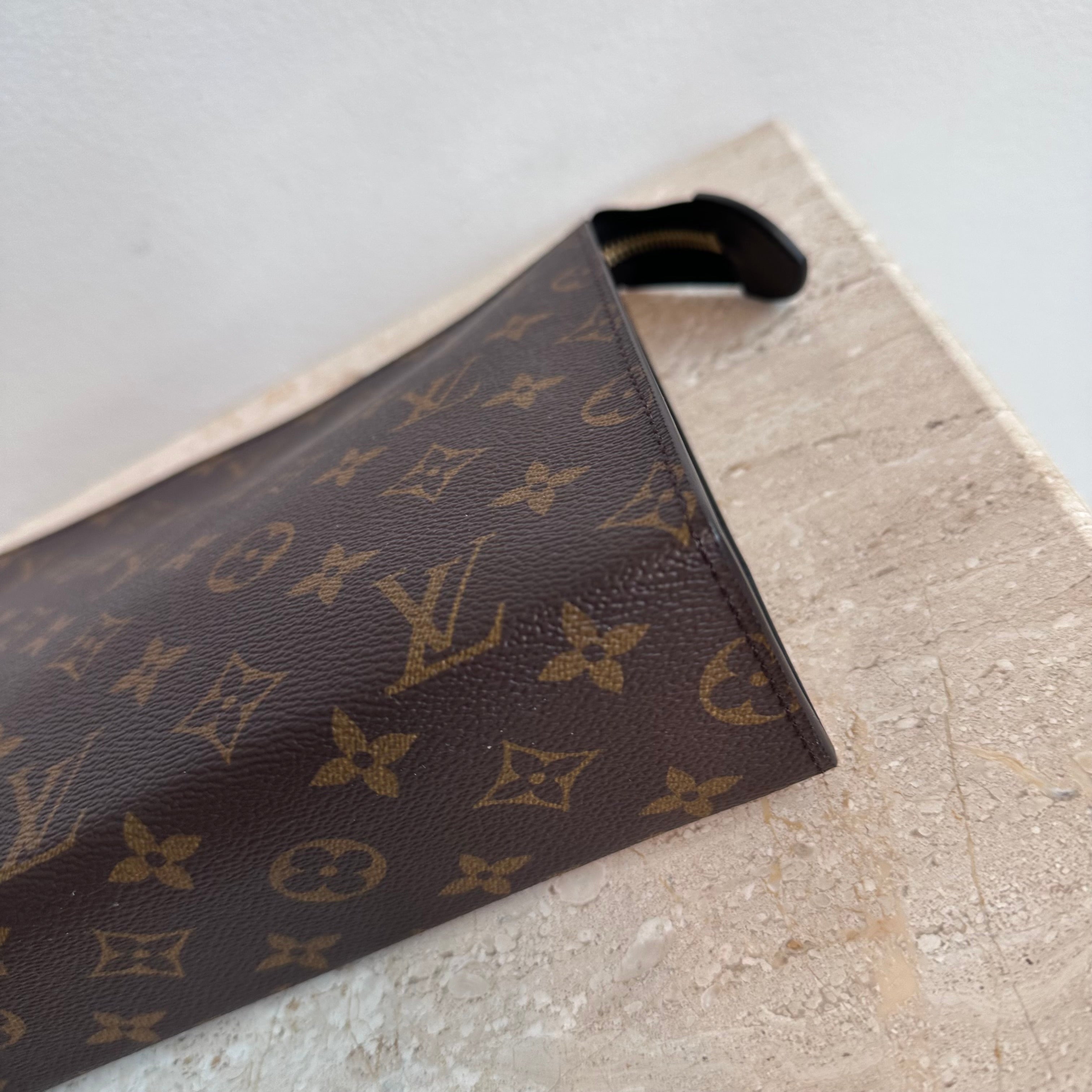 Pre-Owned Louis Vuitton Monogram Poche Toilette NM. Crafted in monogram canvas with a fine black cowhide interior and a gold-tone zipper closure. The interior design incorporates four card slots and a patch pocket for papers. A convenient and stylish way to carry necessities!