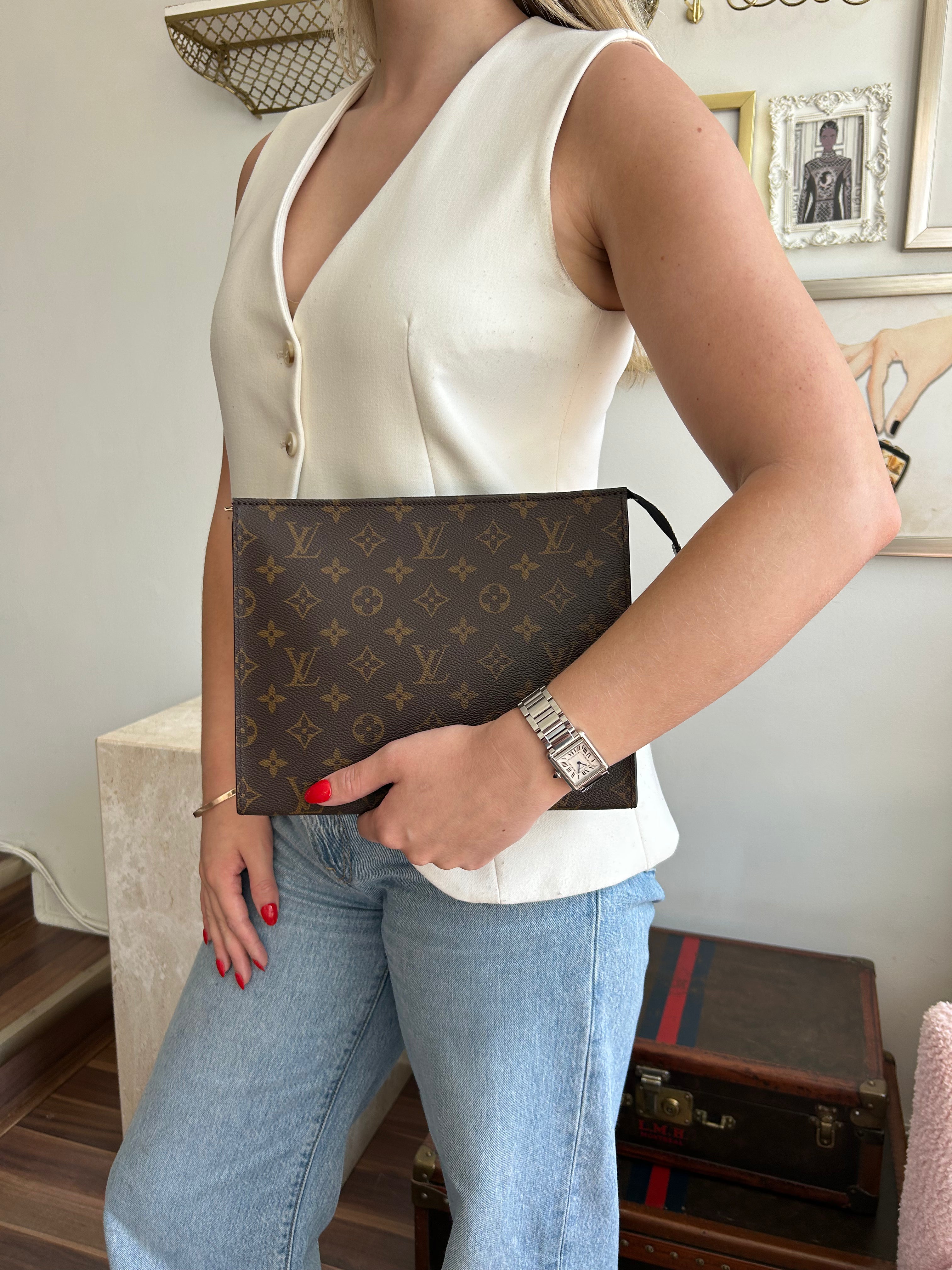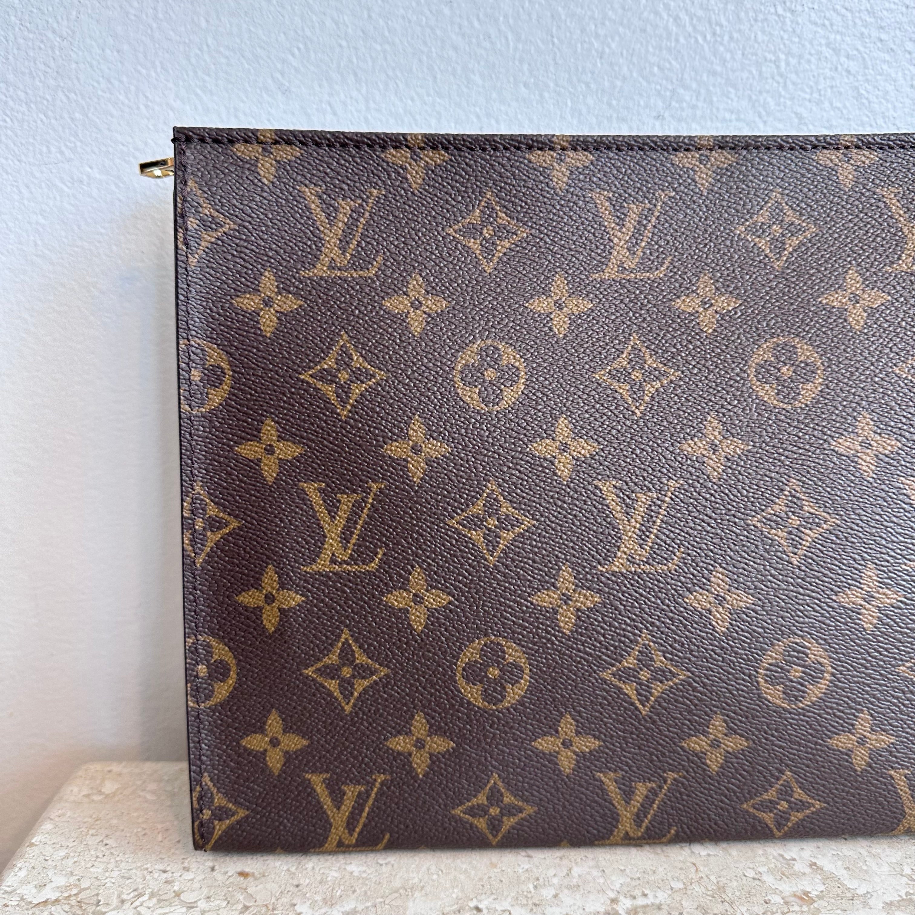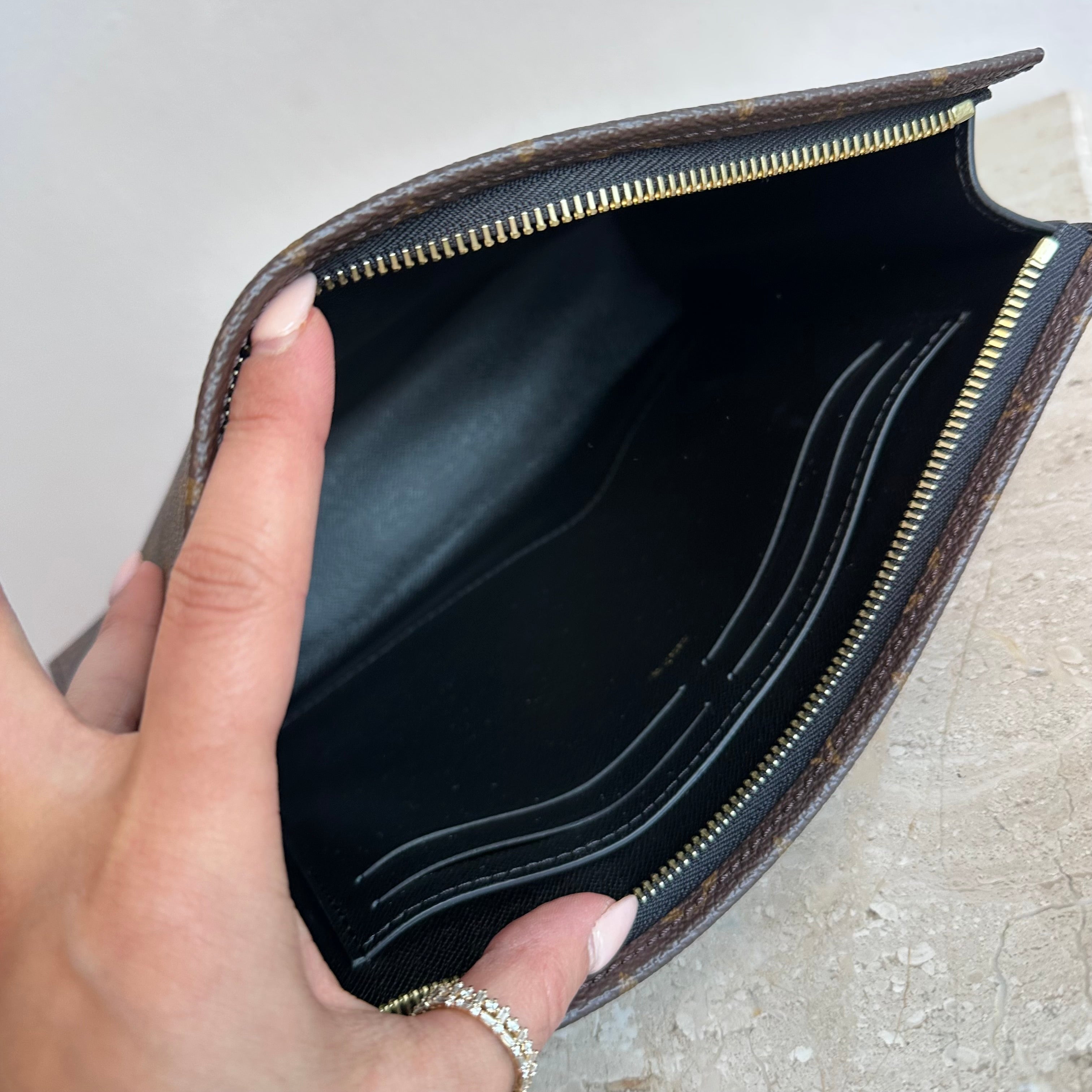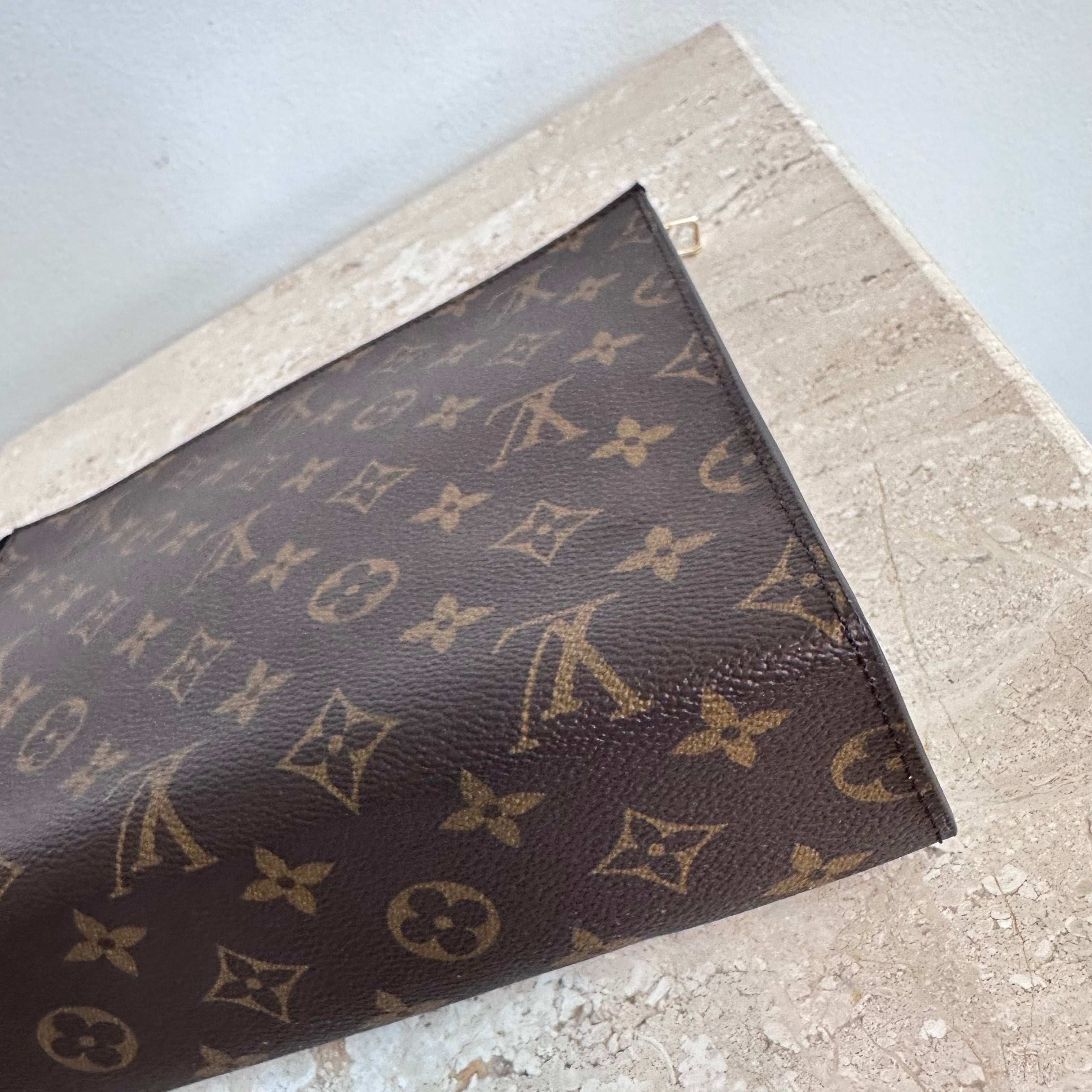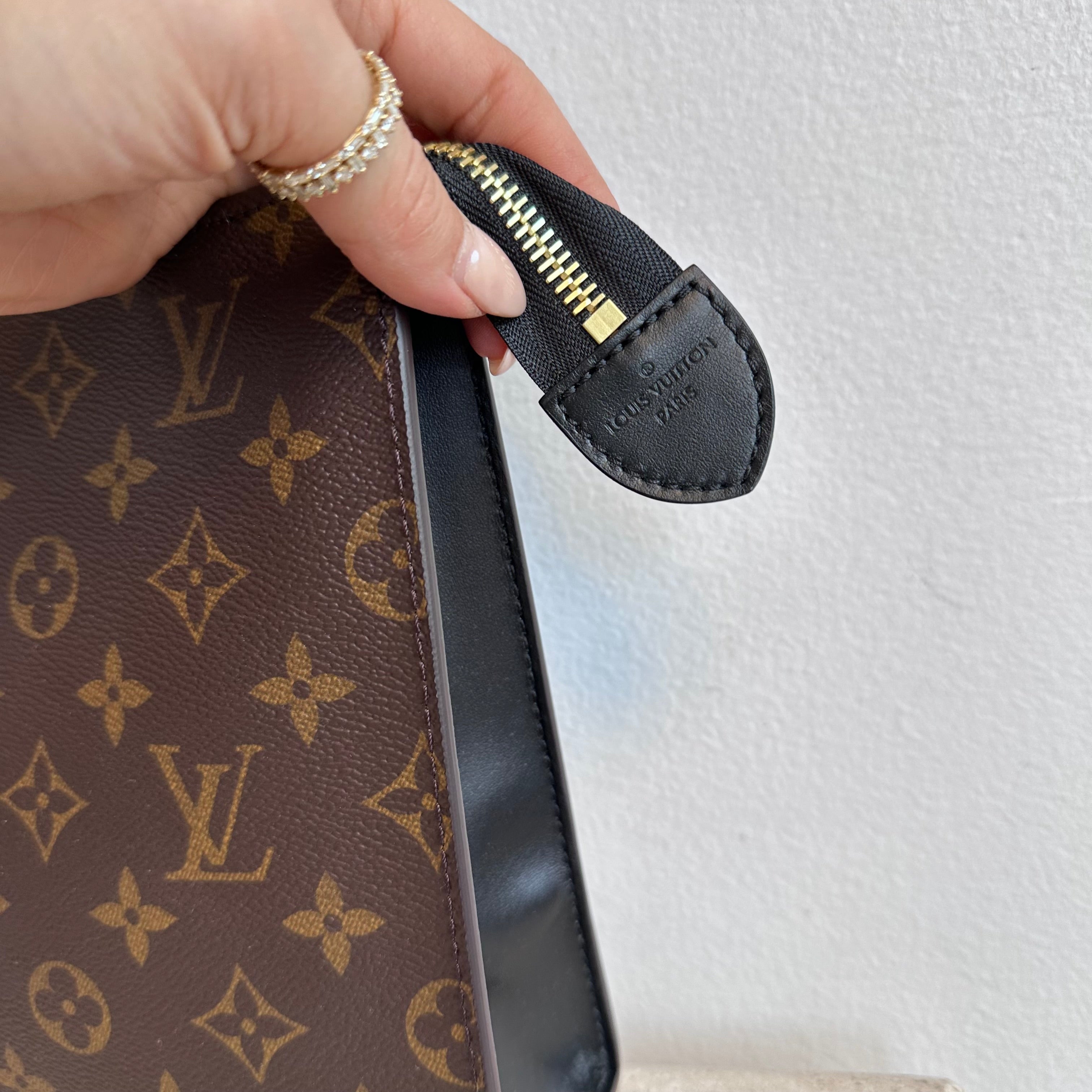 Pre-Owned Louis Vuitton Monogram Poche Toilette NM. Crafted in monogram canvas with a fine black cowhide interior and a gold-tone zipper closure. The interior design incorporates four card slots and a patch pocket for papers. A convenient and stylish way to carry necessities!