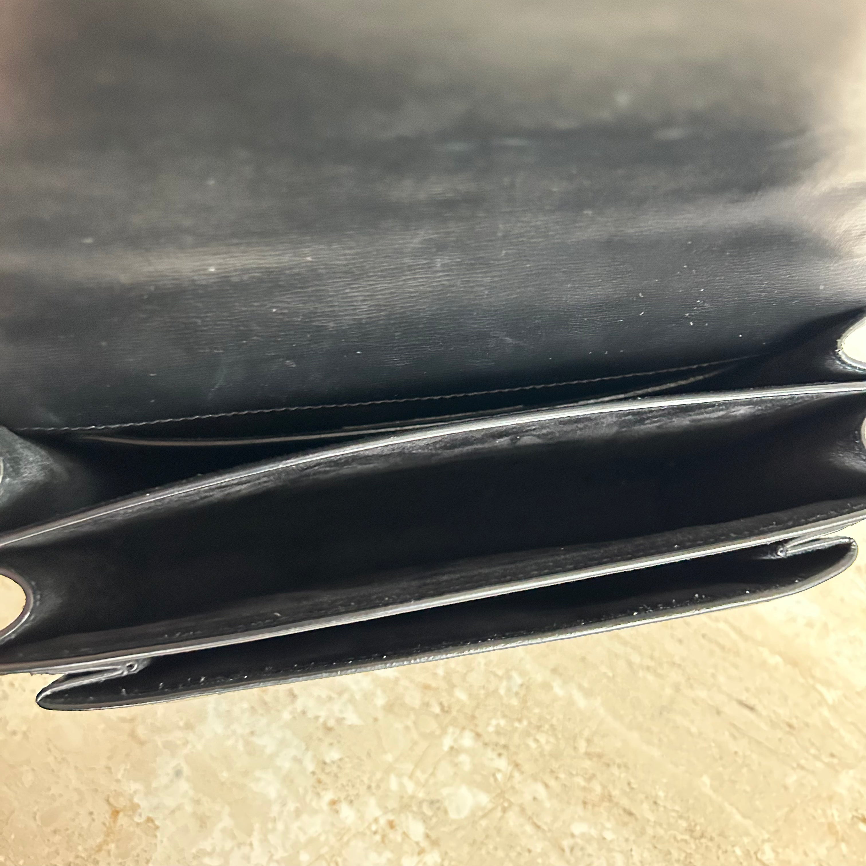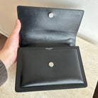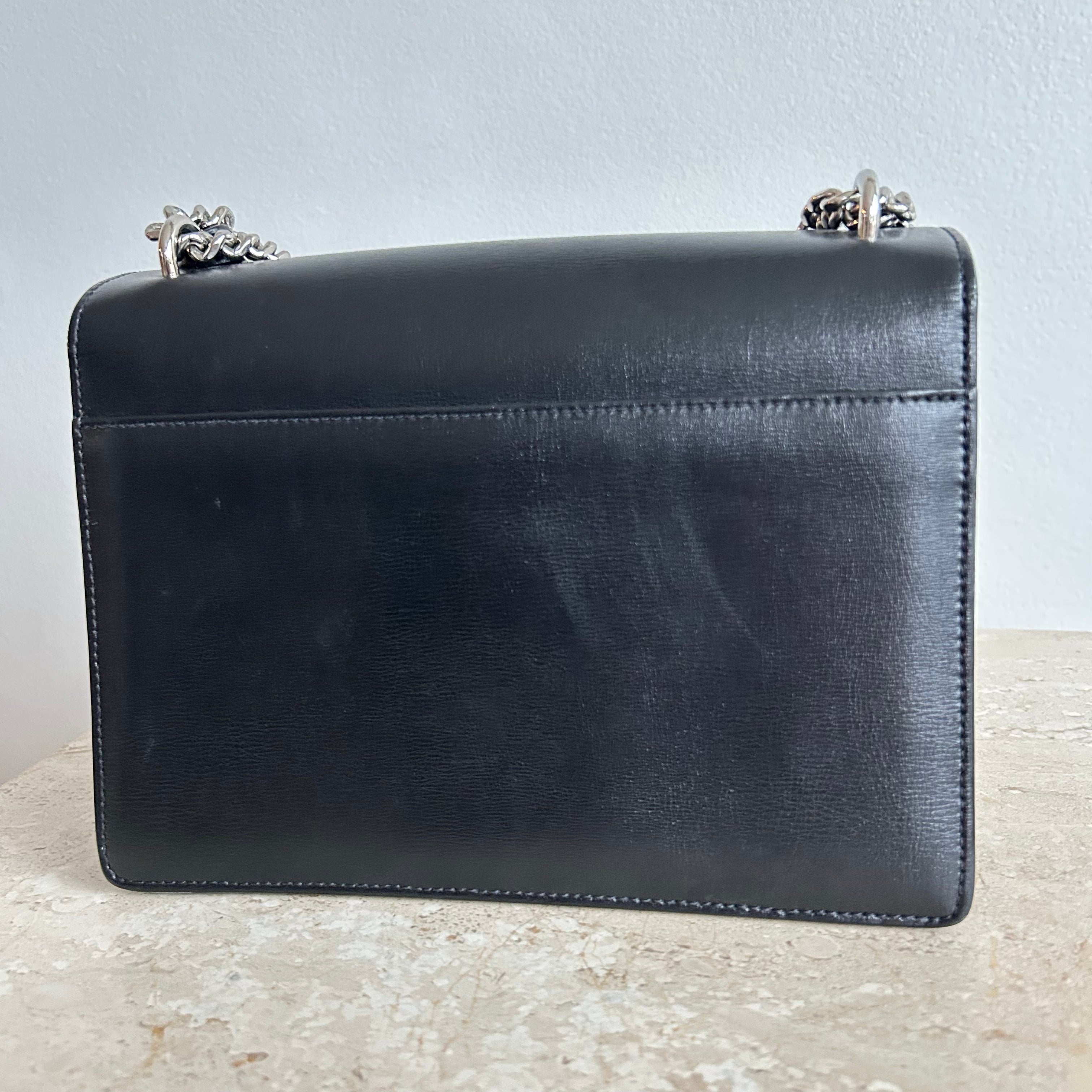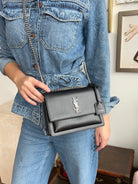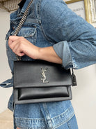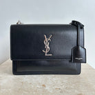 Pre-Owned Saint Laurent Medium Black Sunset Shoulder Bag. Crafted of smooth black leather with full front flap, side gussets and gorgeous silver tone chain and leather comfort strap. The interlocking logo is front and centre and opens up to one exterior patch pocket and two interior sections with one slit pocket. This is the perfect city bag that keeps you stylish and organized from day to night!