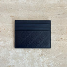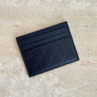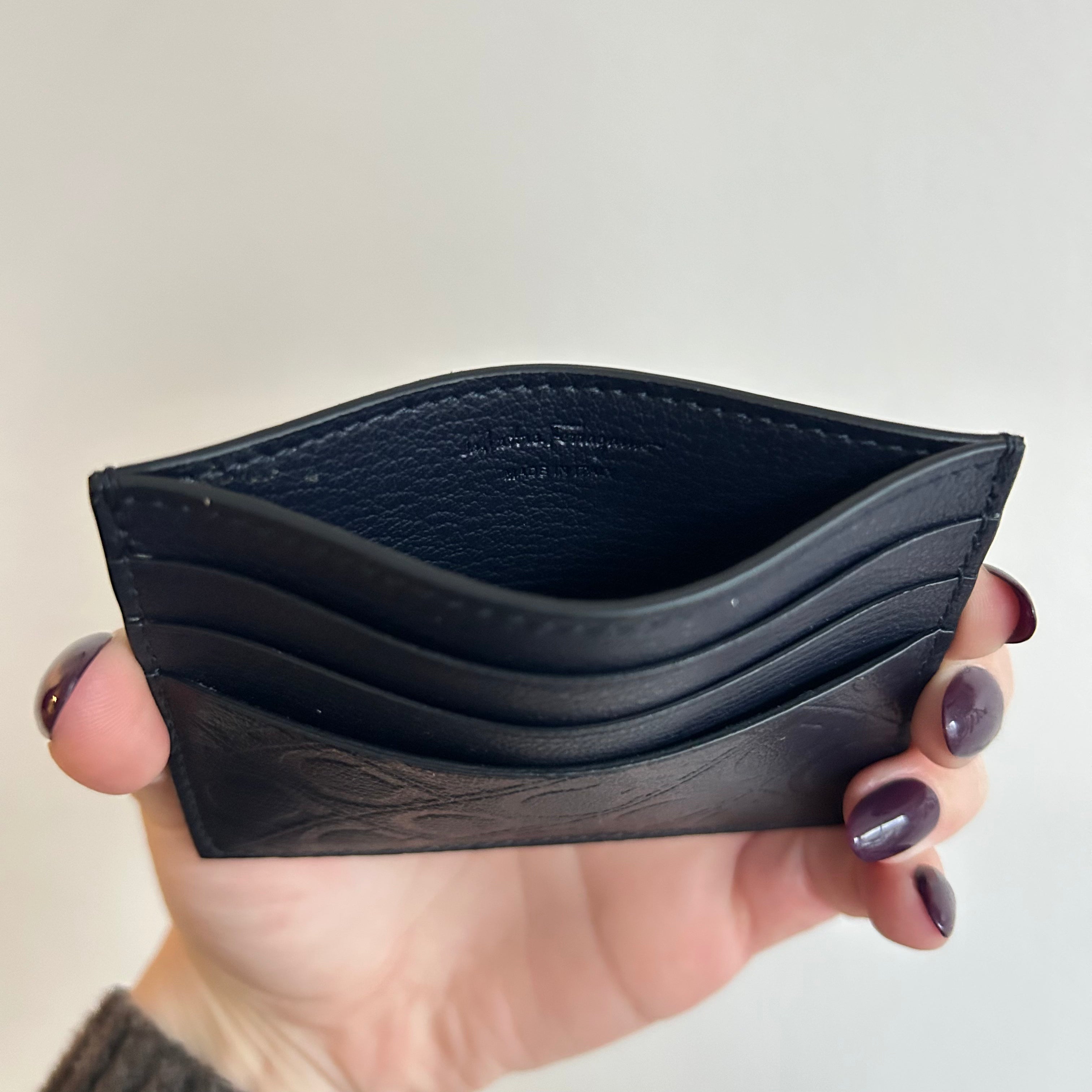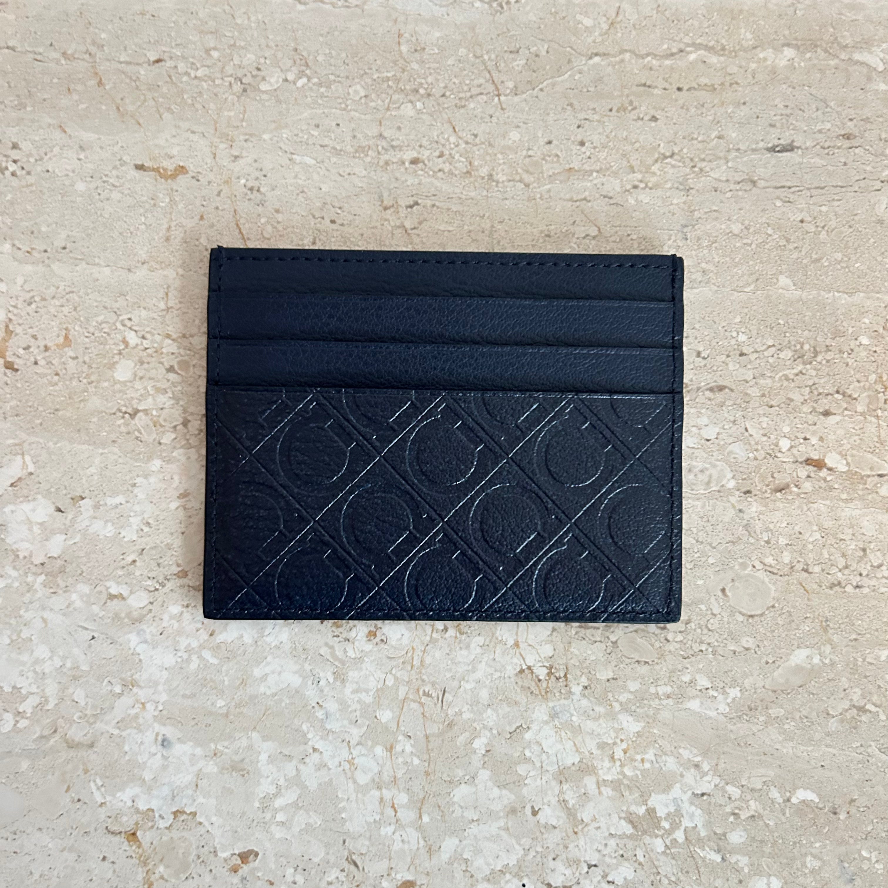 Pre-Owned Salvatore Ferragamo Card Holder. Navy calfskin leather with embossed logo throughout. Three exterior card slots on each side and one larger interior slot. Perfect for gifting!
