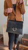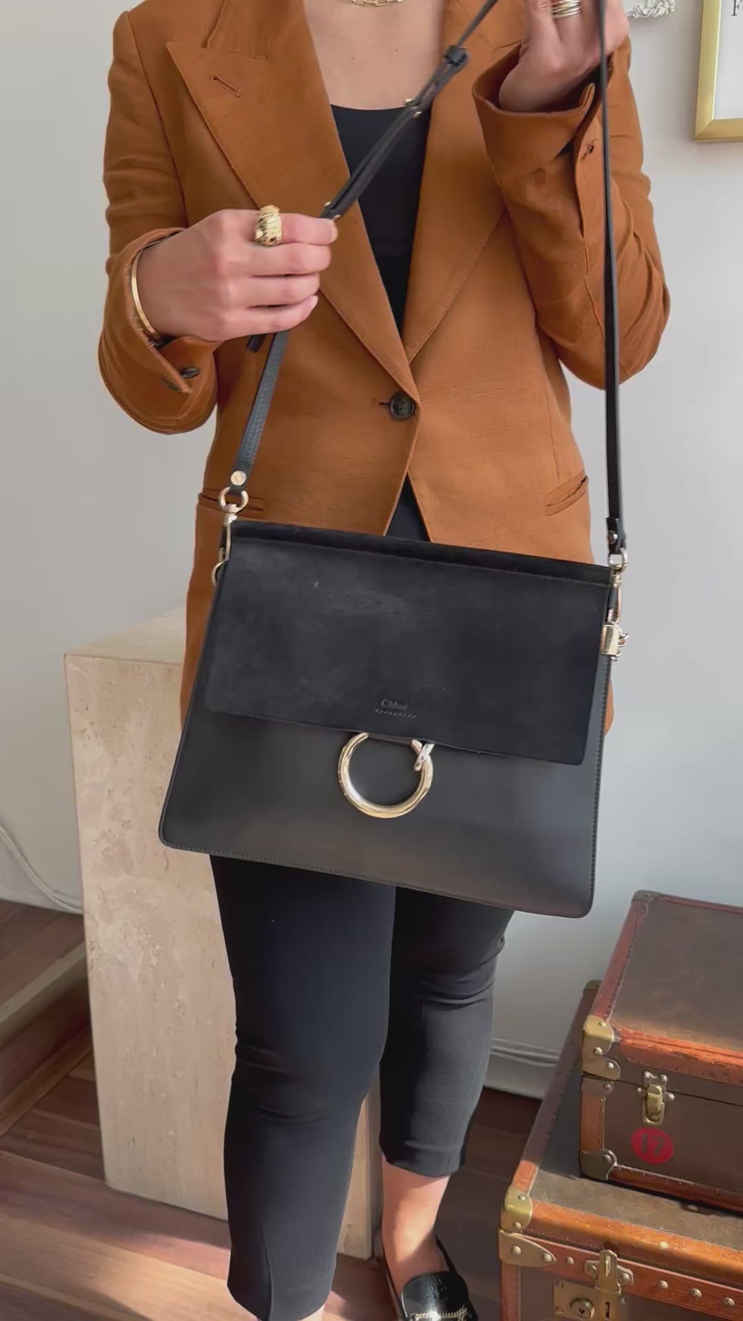 Pre-Owned Chloe Faye Bag Large. This buttery smooth black leather handbag with genuine suede flap creates textural interest to an every day bag! The top flap opens by a snap closure. Finished with an elegant ring buckle and draped chain in gold tone hardware. Includes two interior compartments and an interior zip pocket. A timeless piece!