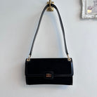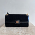Pre-Owned Salvatore Ferragamo Vintage Corduroy Shoulder Bag. This chic shoulder bag is crafted from black corduroy with leather trim and a shoulder strap, accented with gold-tone hardware. The snap closure opens to a fabric-lined interior with one zip pocket. Such a gorgeous vintage find!