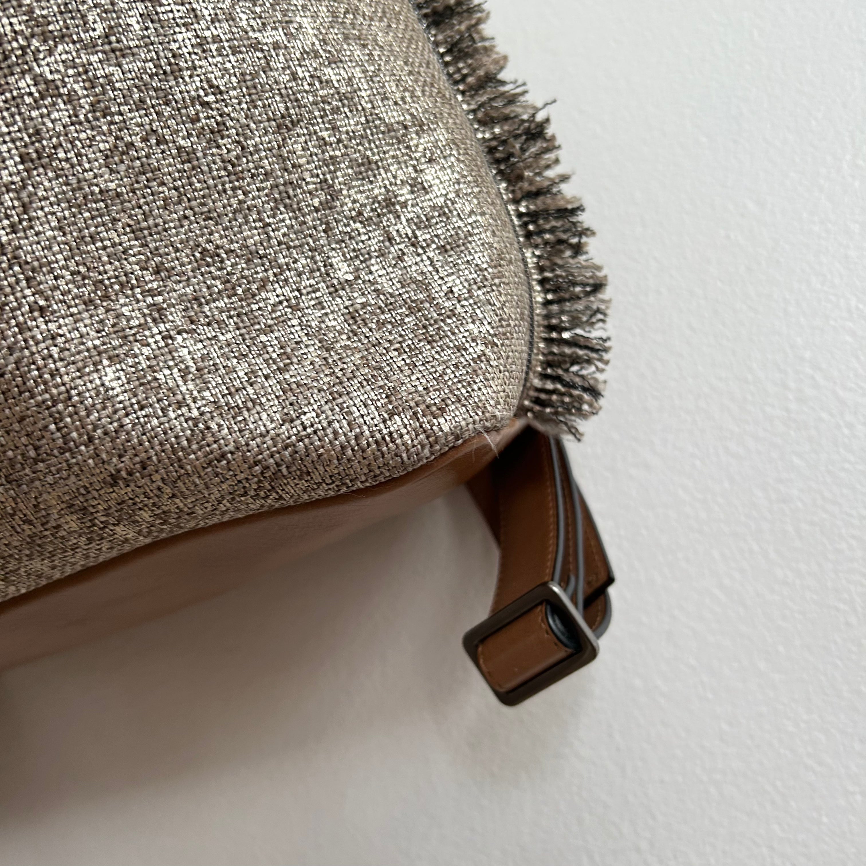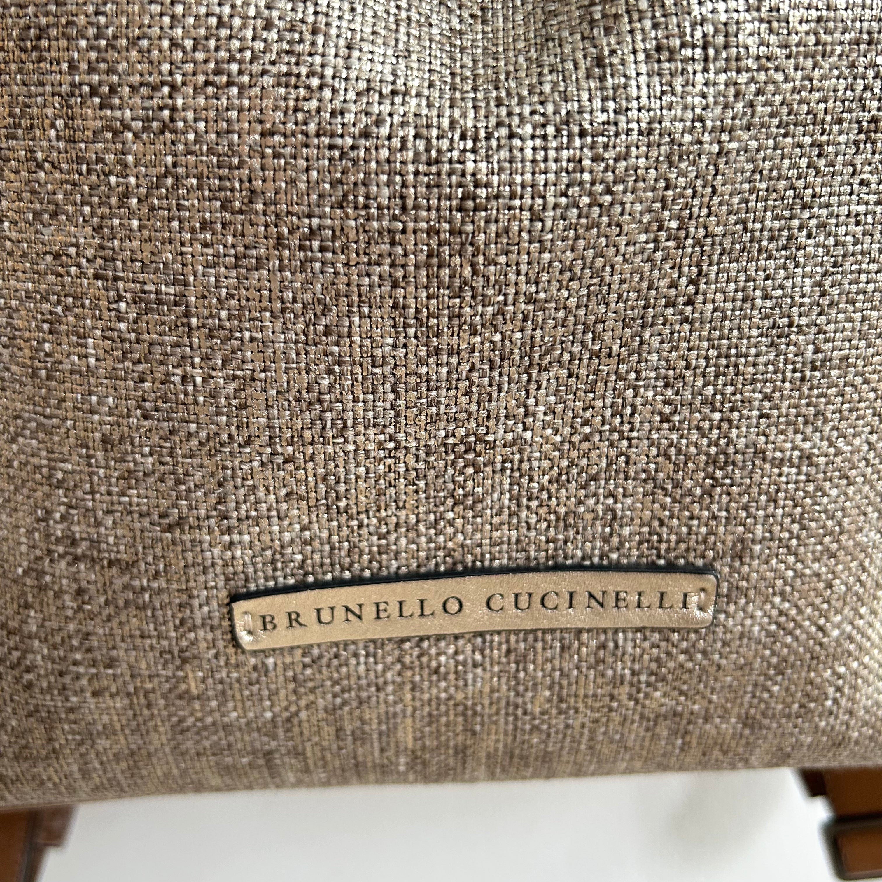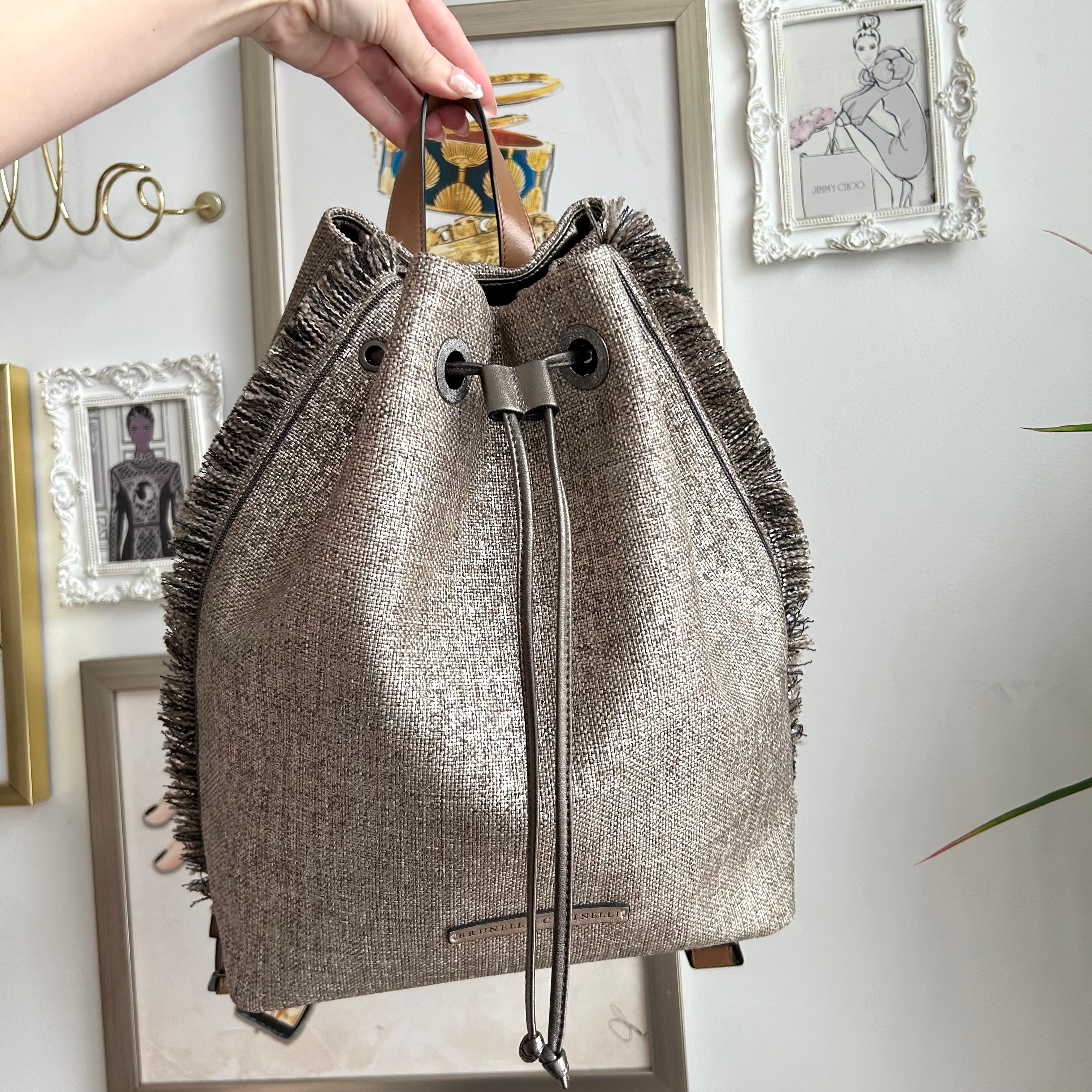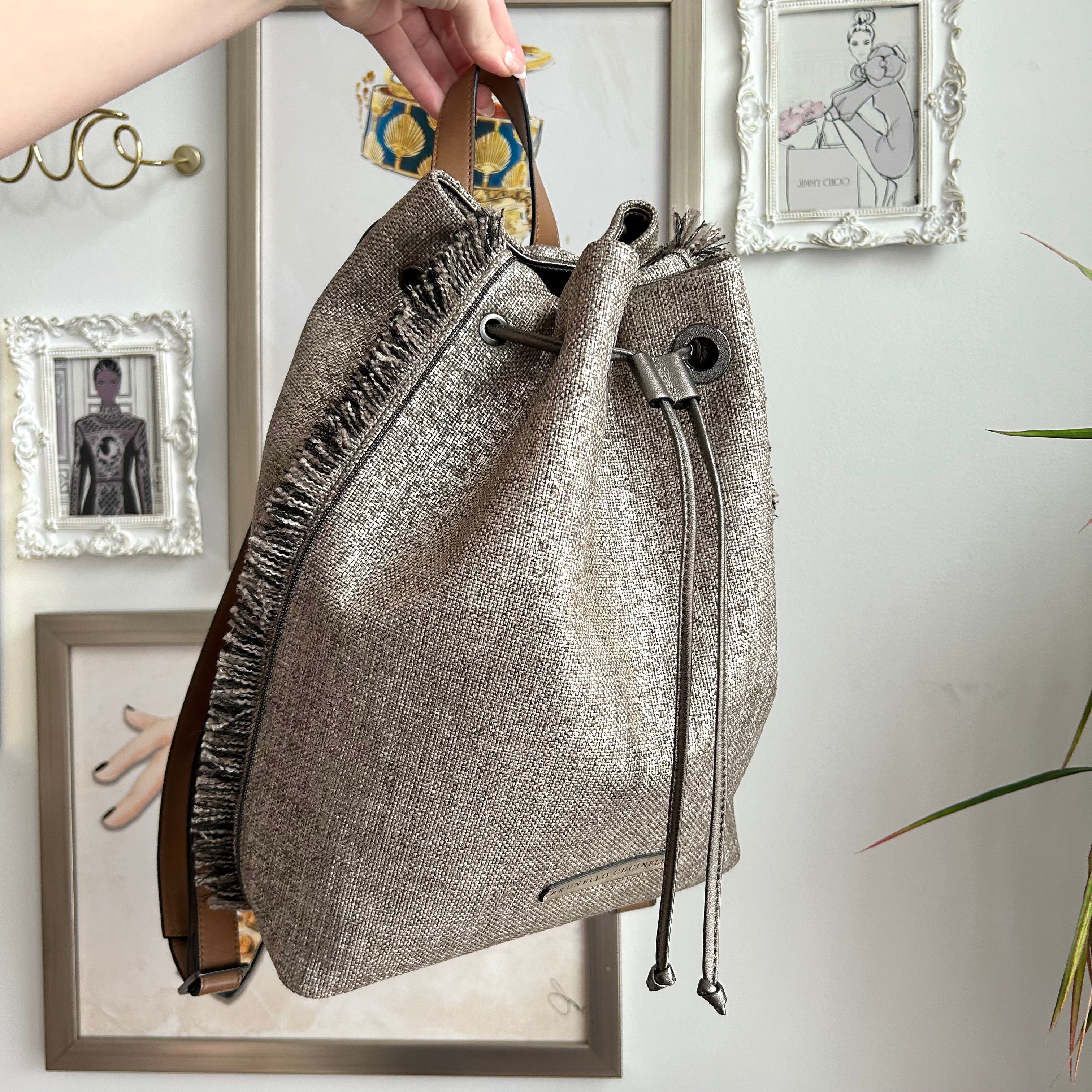 Pre-Owned Brunello Cucinelli Metallic Canvas Fringe Backpack. From Spring/Summer 2019, this fab backpack is in a metallic canvas with fringe details on the sides. Brown leather base with a matching handle and adjustable backpack straps. Drawstring opening reveals a fabric lined interior hosting one zip pocket. This is such a fab bag from an incredible brand!