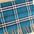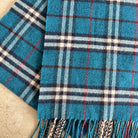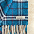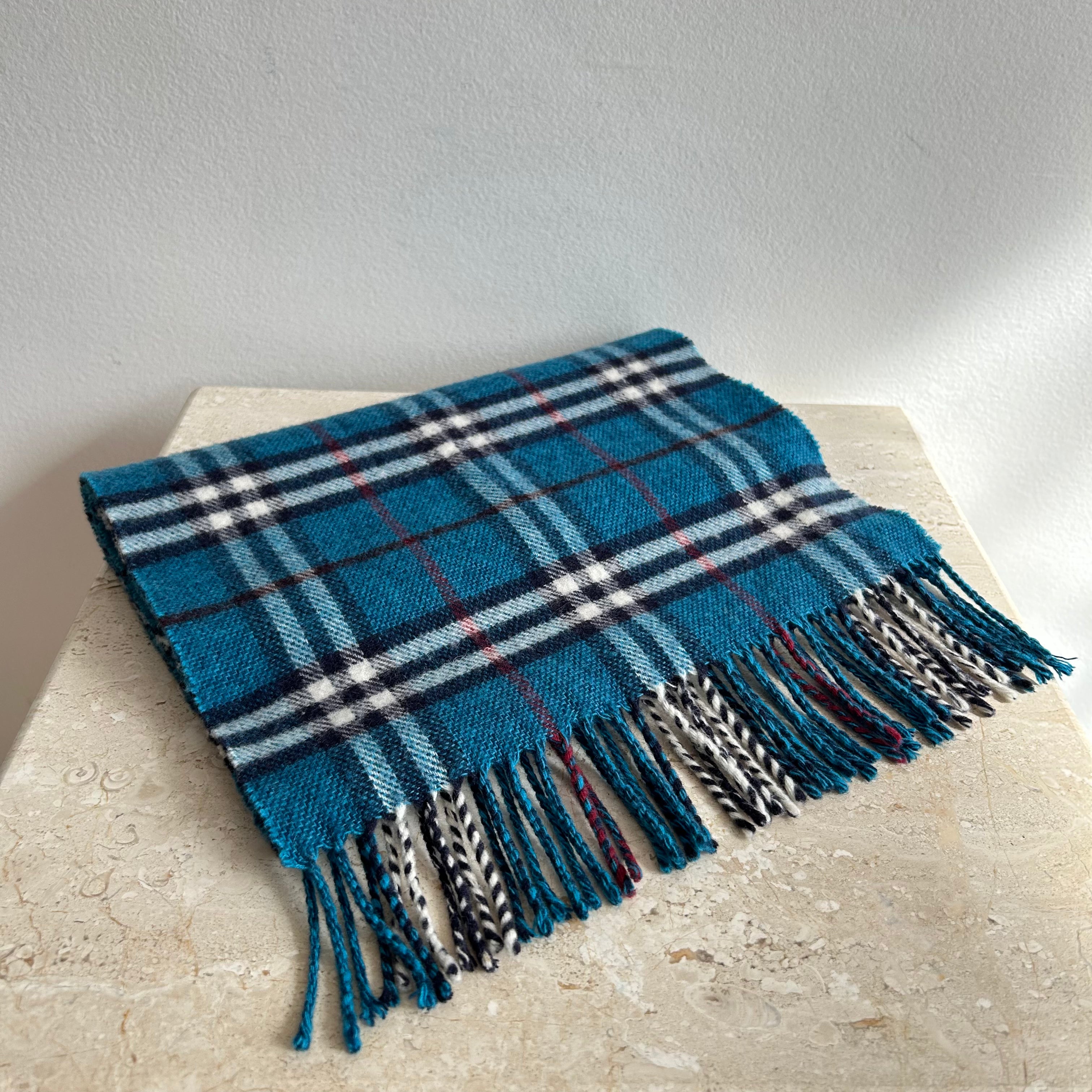 Pre-Owned Burberry Blue Check Wool/Cashmere Scarf. Made in 90% Merino and 10% Cashmere, in a mix of blues, this scarf is made in the classic Burberry check and features 2.5" fringe on each end. Embedded with history and tradition, this scarf is an iconic accessory.