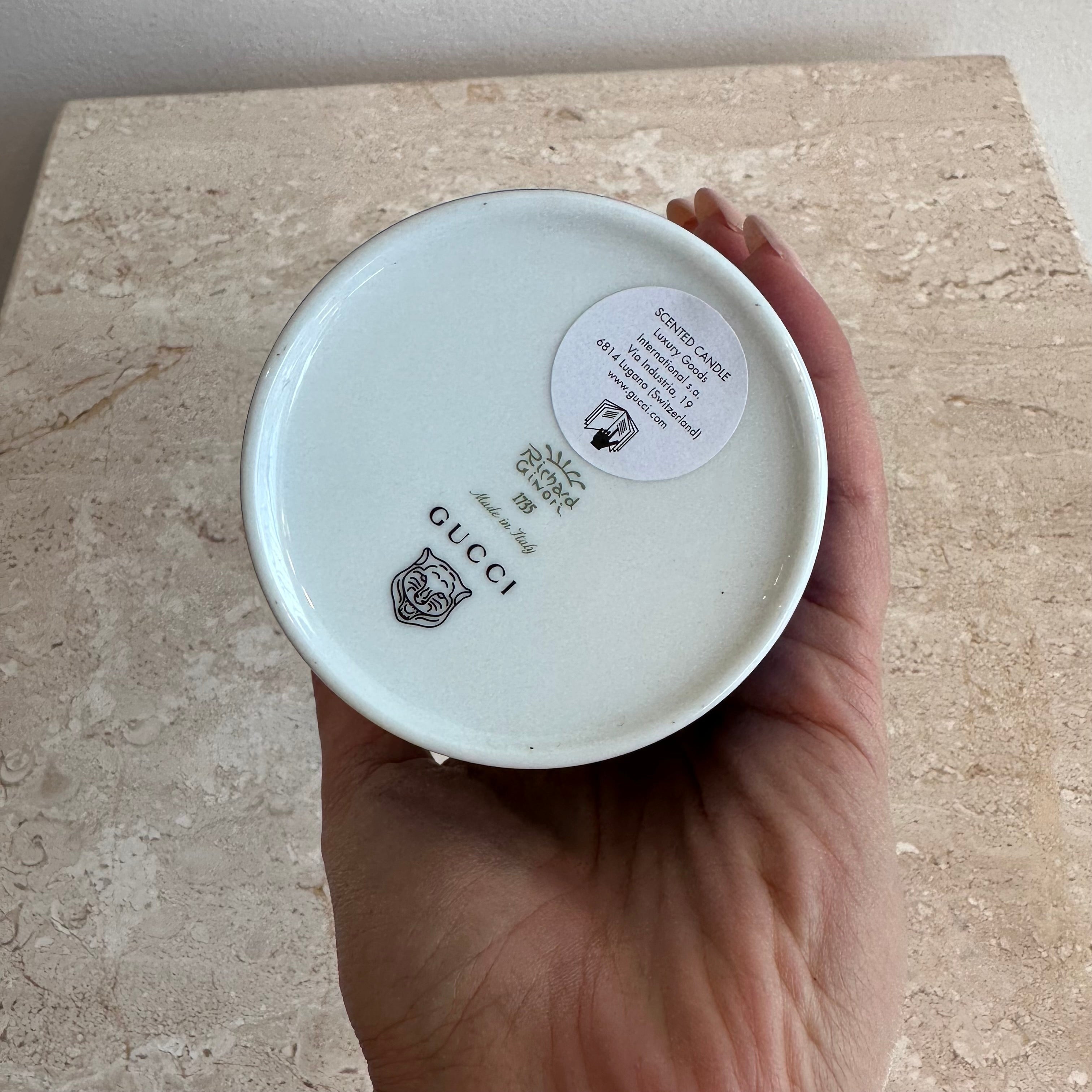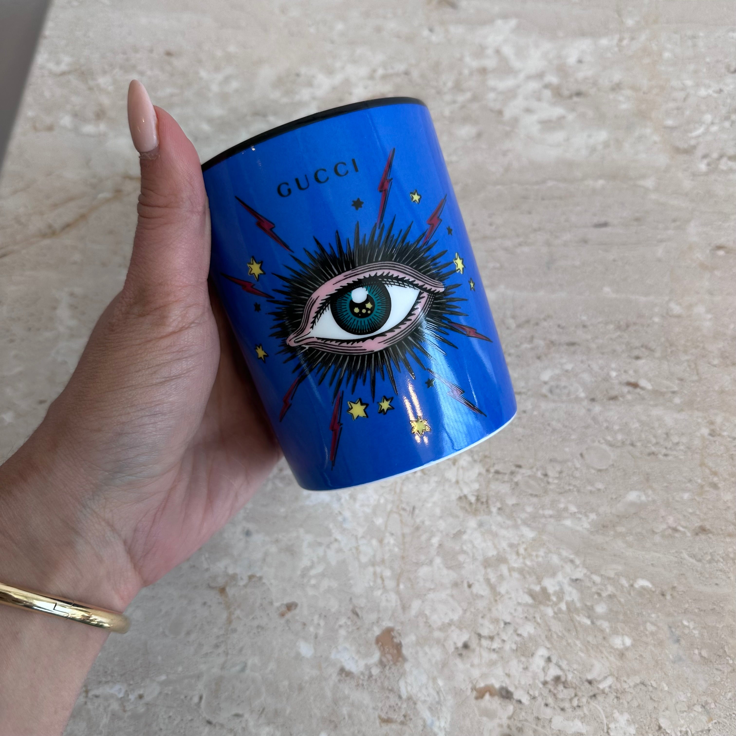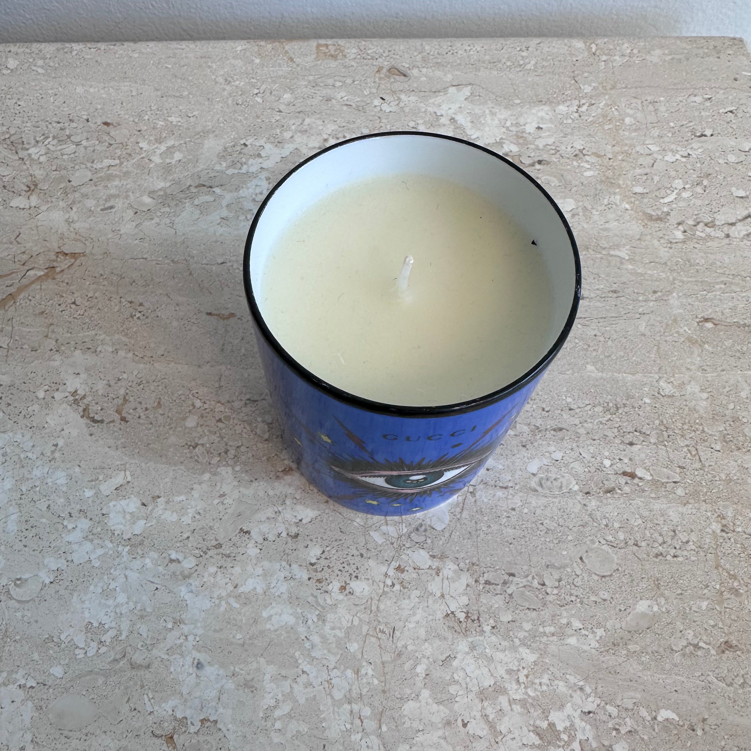 Pre-Owned Gucci Fumus Star Eye Scented Candle. This paraffin wax candles brings together notes of orange leaves and beeswax, reminiscent of an Artisan's Florentine workshop. In a reusable Richard Ginori porcelain container featuring an intricate eye design.