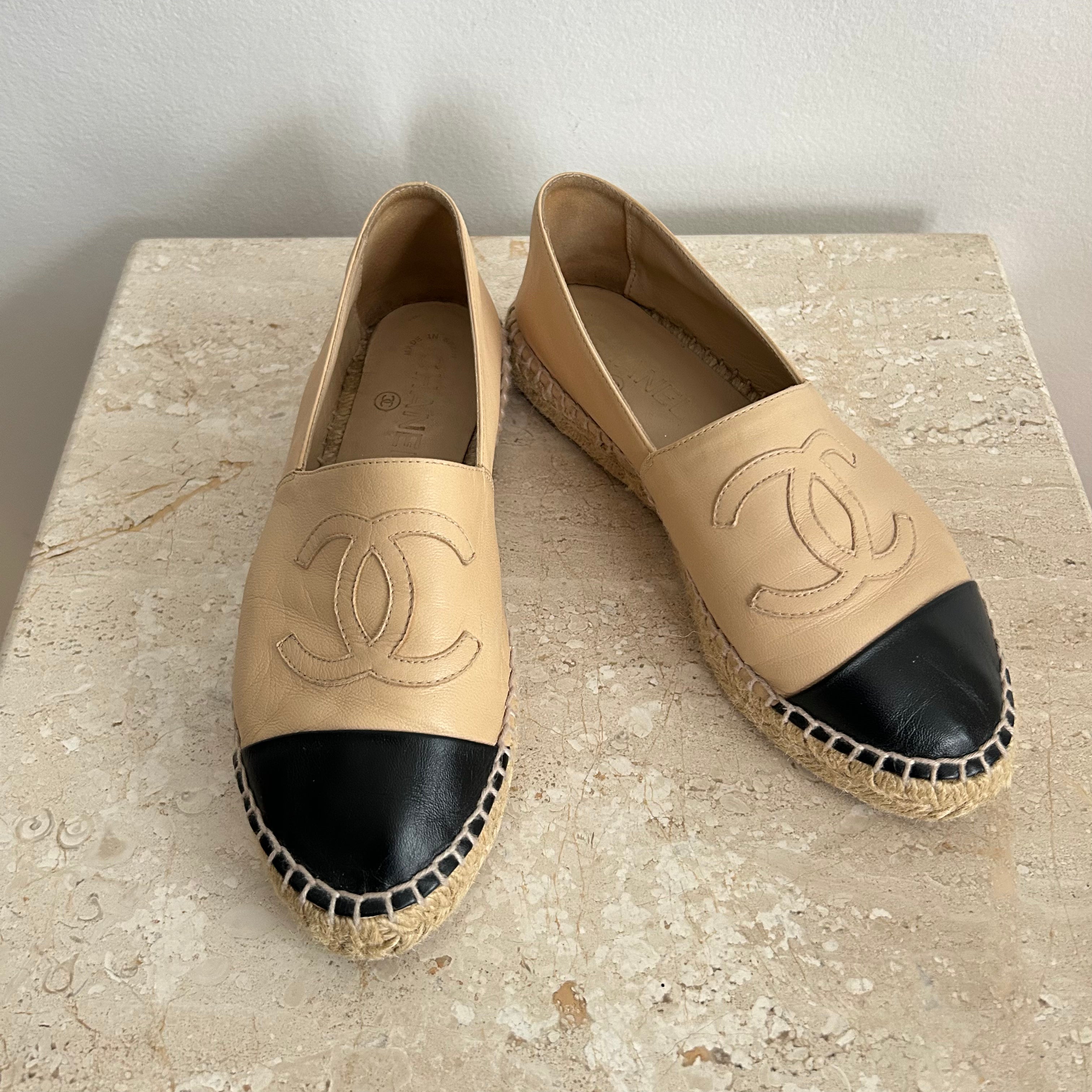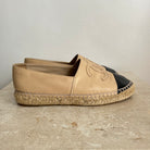 Pre-Owned Chanel™ Beige Leather Espadrilles. These gorgeous shoes are crafted in beige lambskin leather with a natural woven midsole and a rubber sole. They feature the classic logo and a black toe and are a great way to add style to your next outfit!