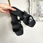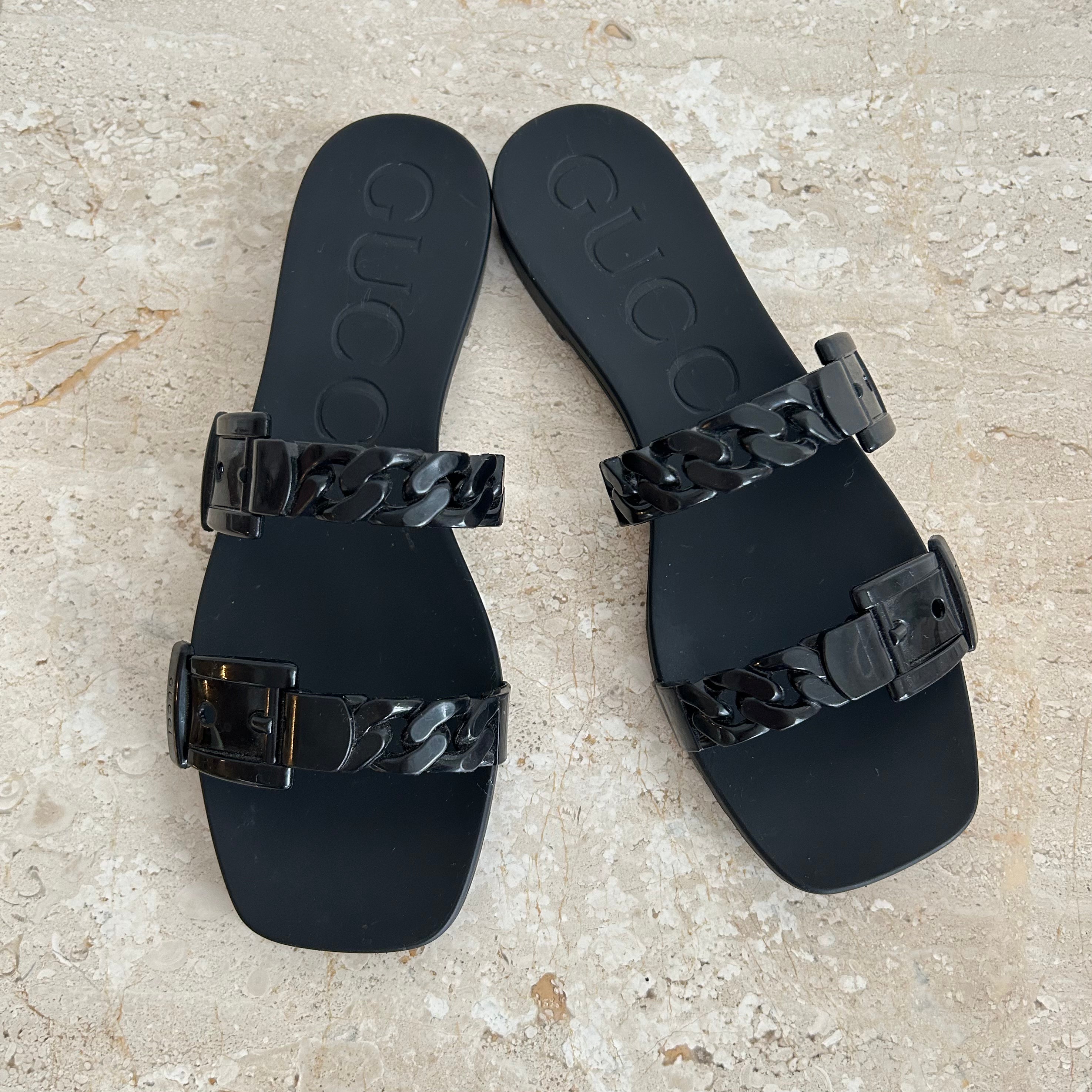 Pre-Owned Gucci Black Rubber Chain Slides. Easy slip on and go, these rubber slides feature two chain detail rubber straps across the top of the foot. These are ideal for vacation or summer days at the beach/pool!