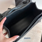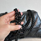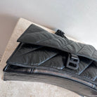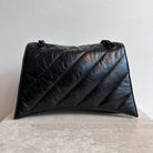 Pre-Owned Balenciaga Crush Medium Chain Bag in black quilted crushed calfskin leather. This bag takes a unique shape, with matte black hardware including B logo and chain strap. Magnetic closure opens to a nappa leather lined interior hosting 3 compartments, a slip pocket and a zip pocket. Such a chic bag in the perfect medium size!