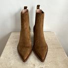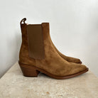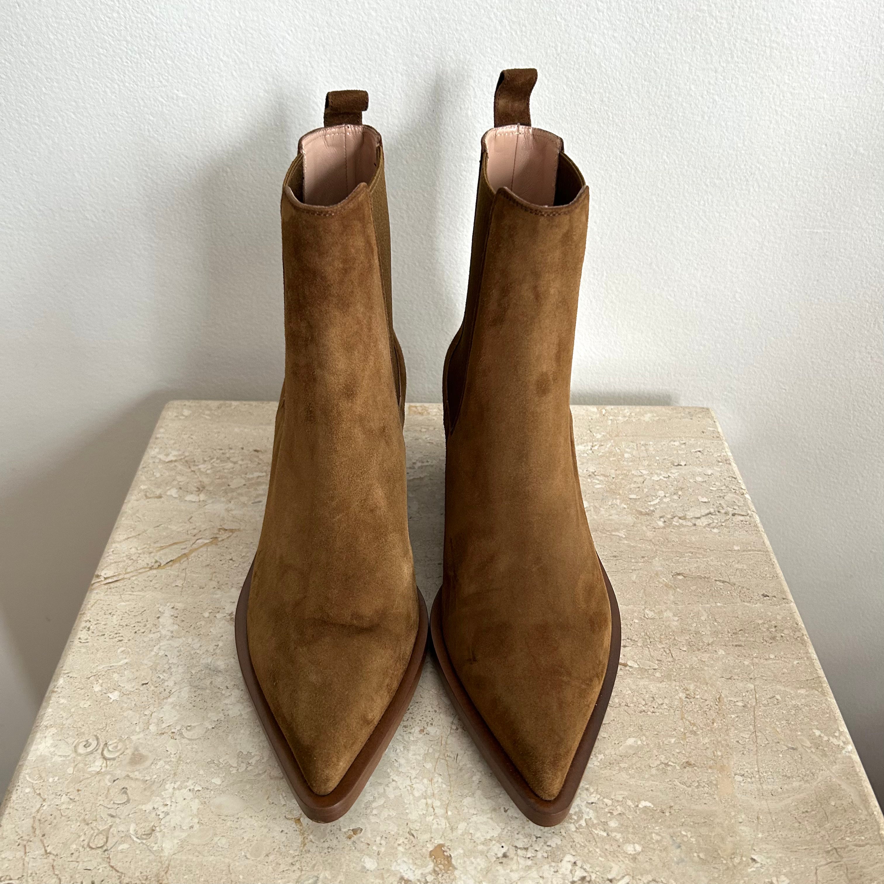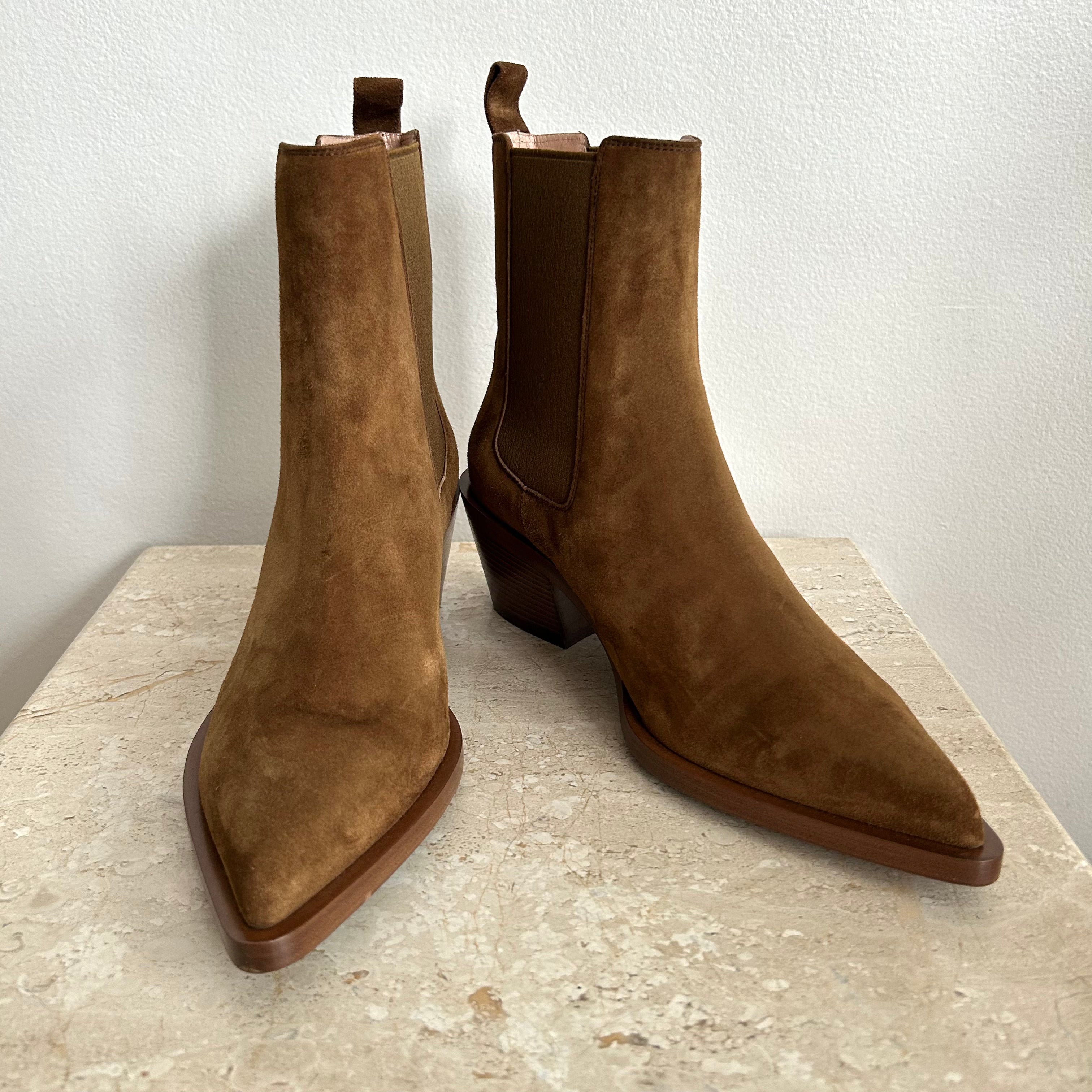Pre-Owned Gianvito Rossi Wylie 45 Suede Ankle Boot. Handmade in Italy, these boots are in 100% brown sue and feature elastic panelling on the sides. With a pointed toe, these boots are so chic!