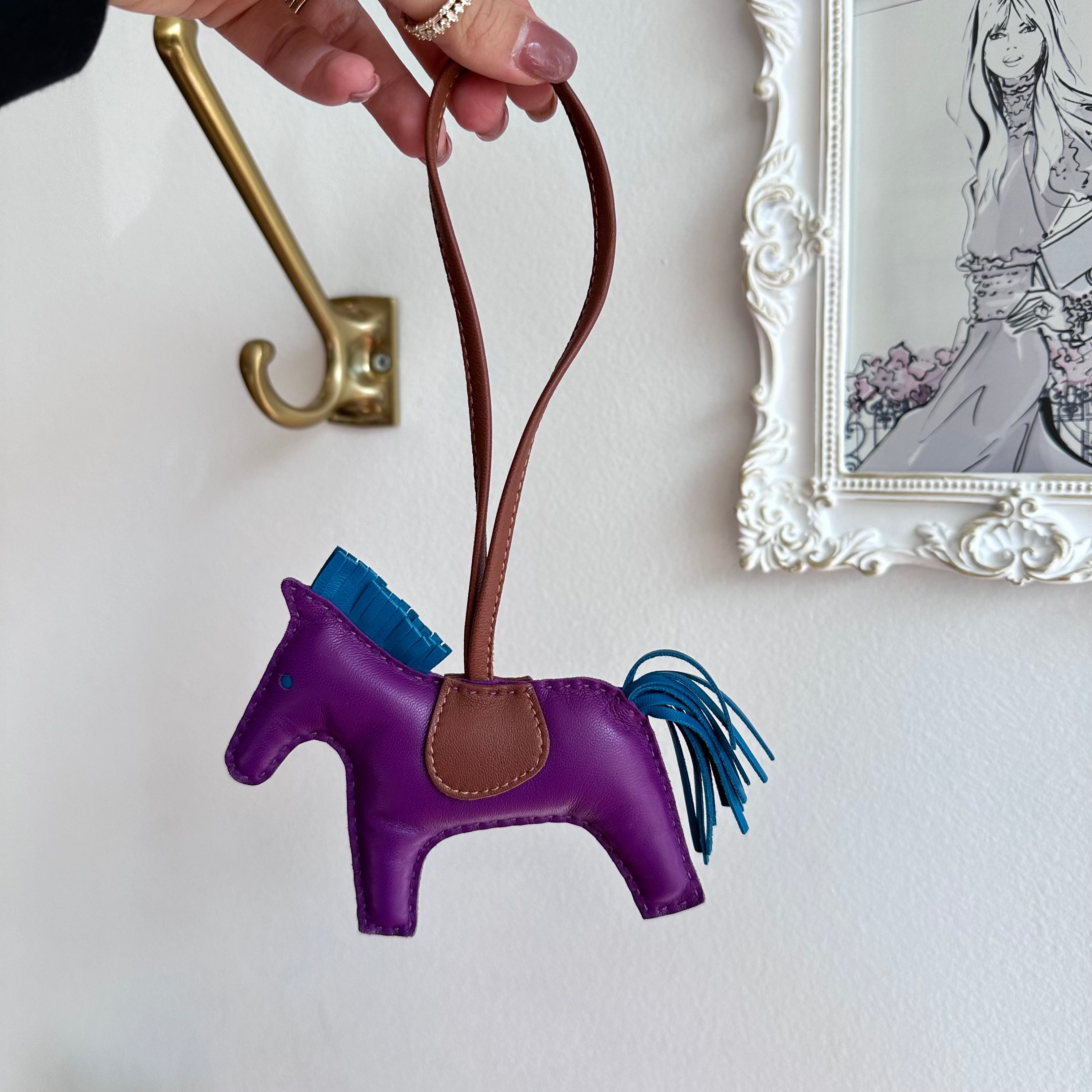 Pre-Owned Hermes Milo Lambskin Grigri Rodeo Horse Bag Charm MM in Anemone Bleu Izmir Fauve. Stuffed lambskin leather with fringe mane and tail. The sweetest adornment for your bag in a great colour!