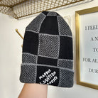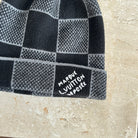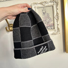 Pre-Owned Louis Vuitton Black Damier Heritage Beanie Toque. Crafted in 100% wool, this beanie features black and grey checkered knit, with an embroidered emblem designed by creative director Pharrell Williams. This is the perfect piece to keep you warm this winter! *Perfume Scent