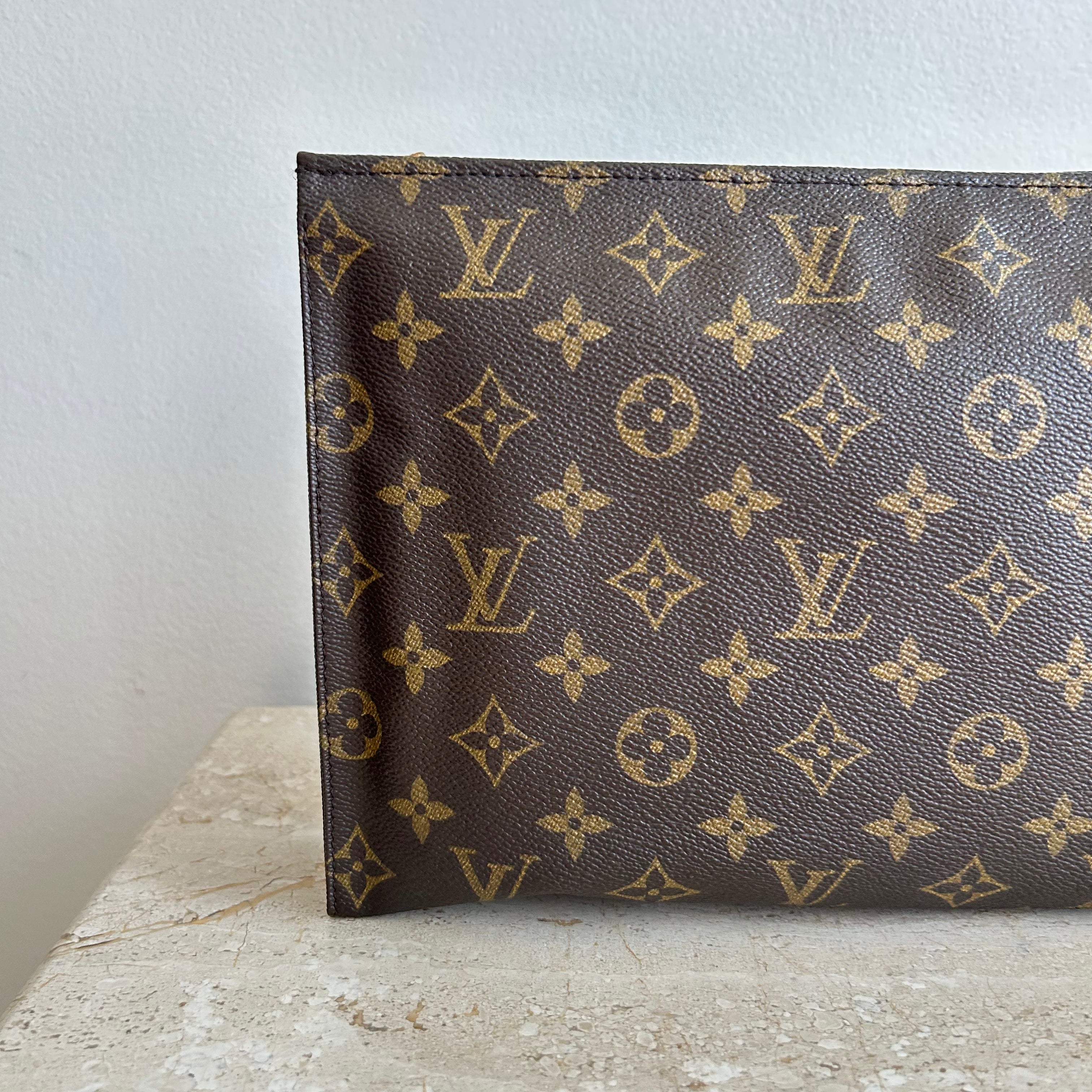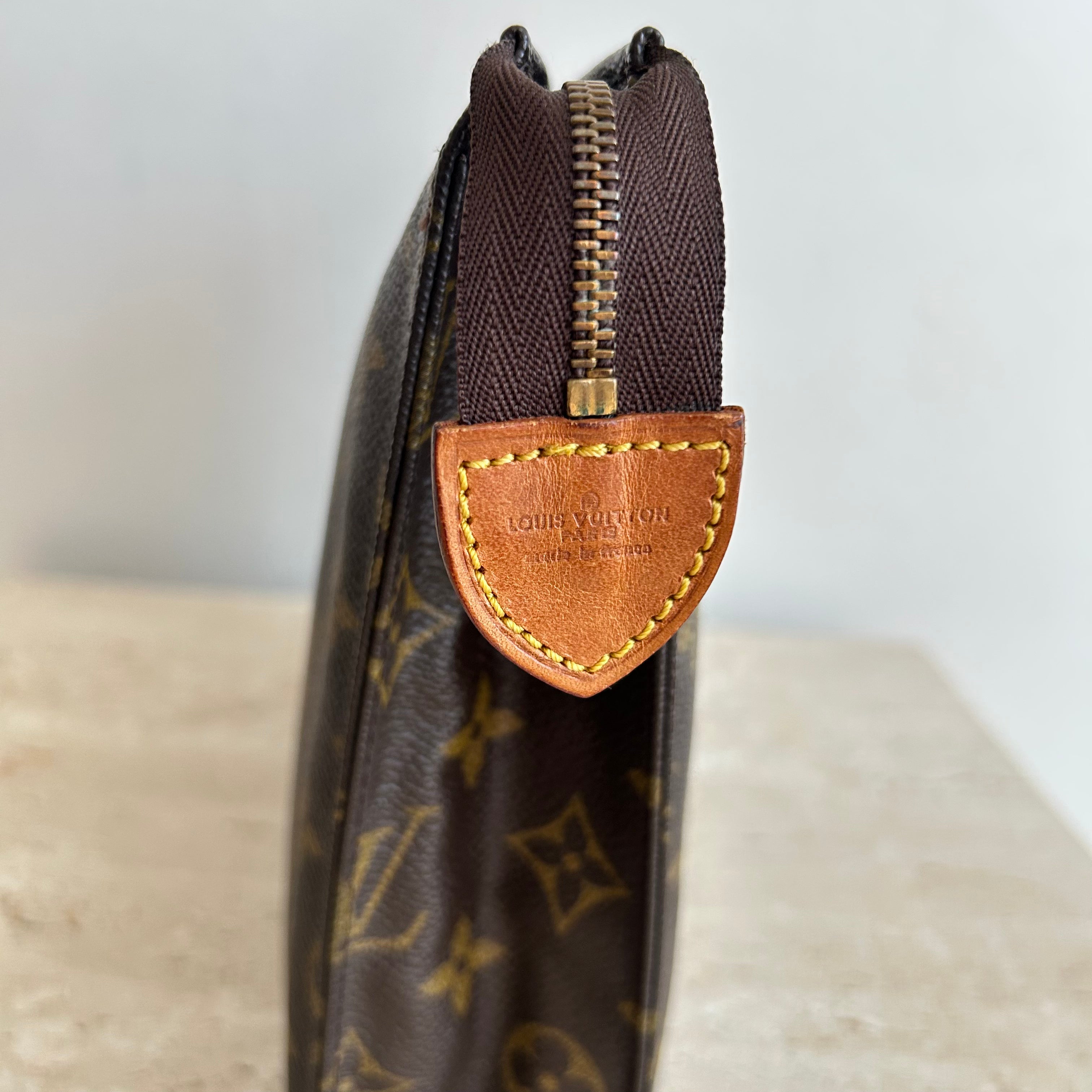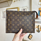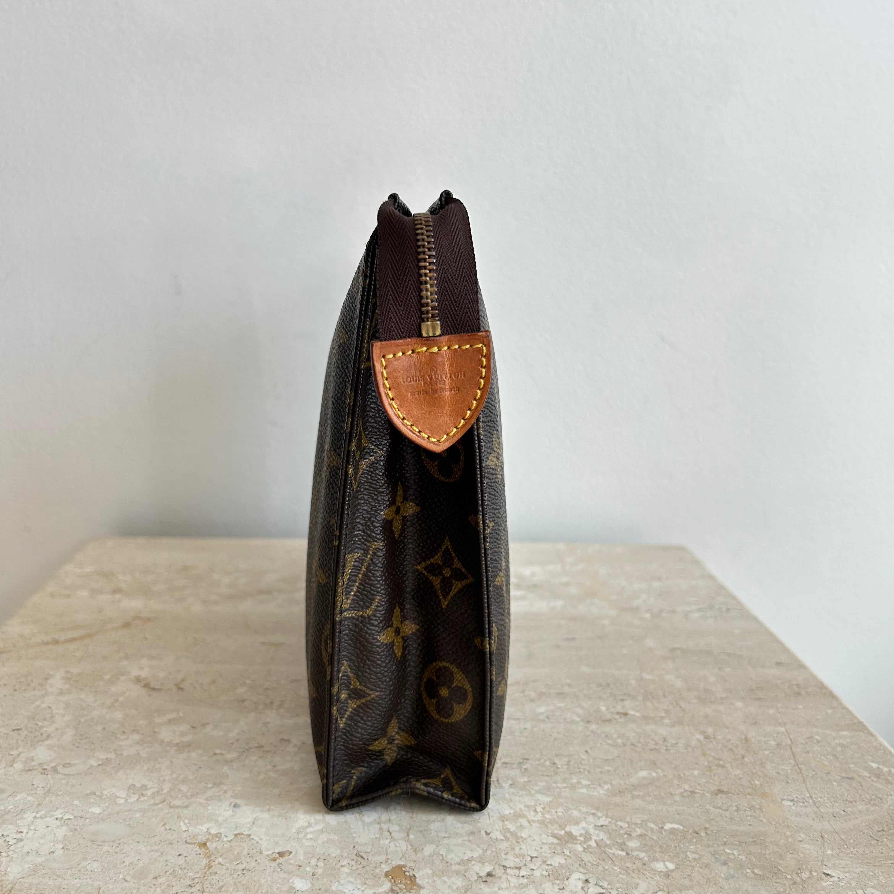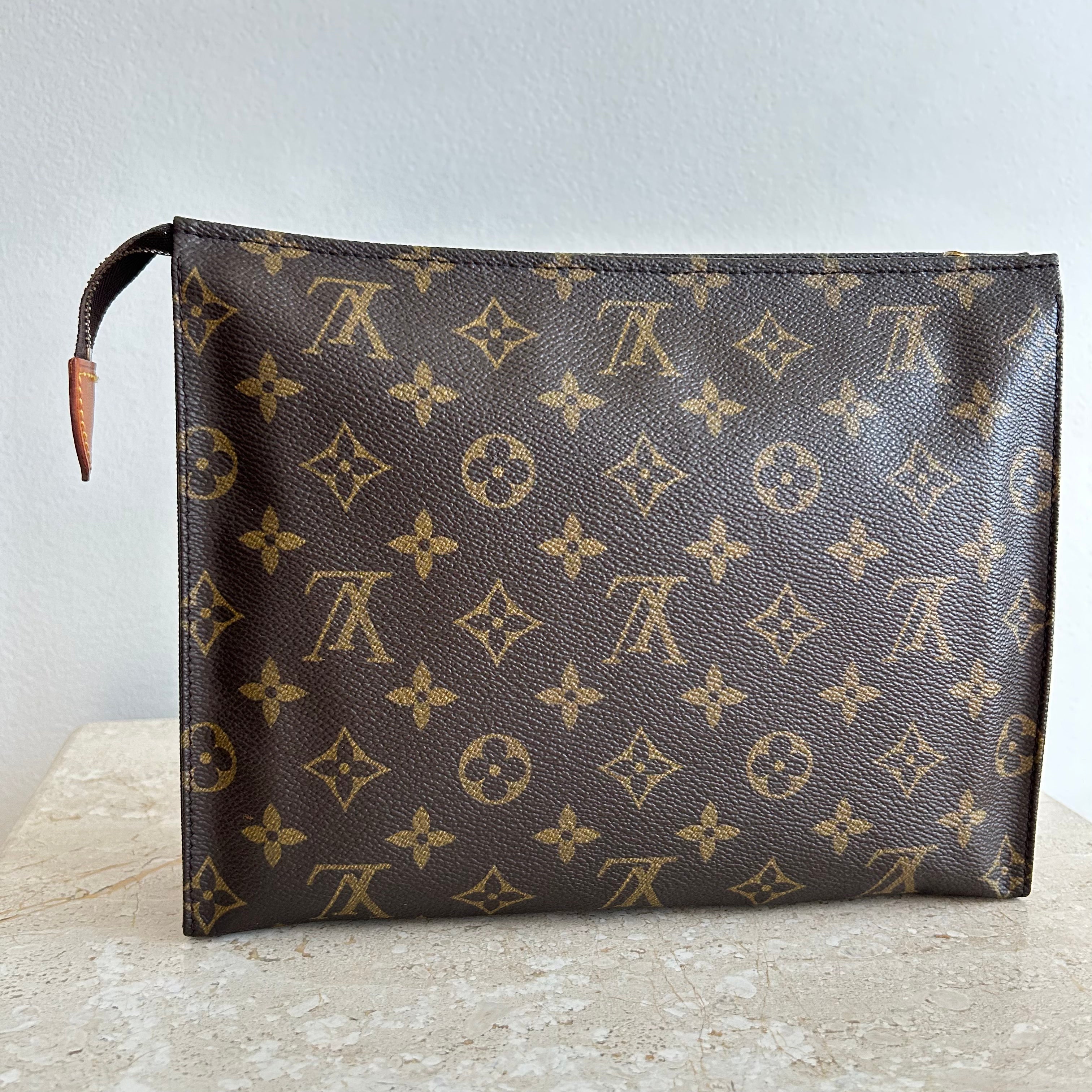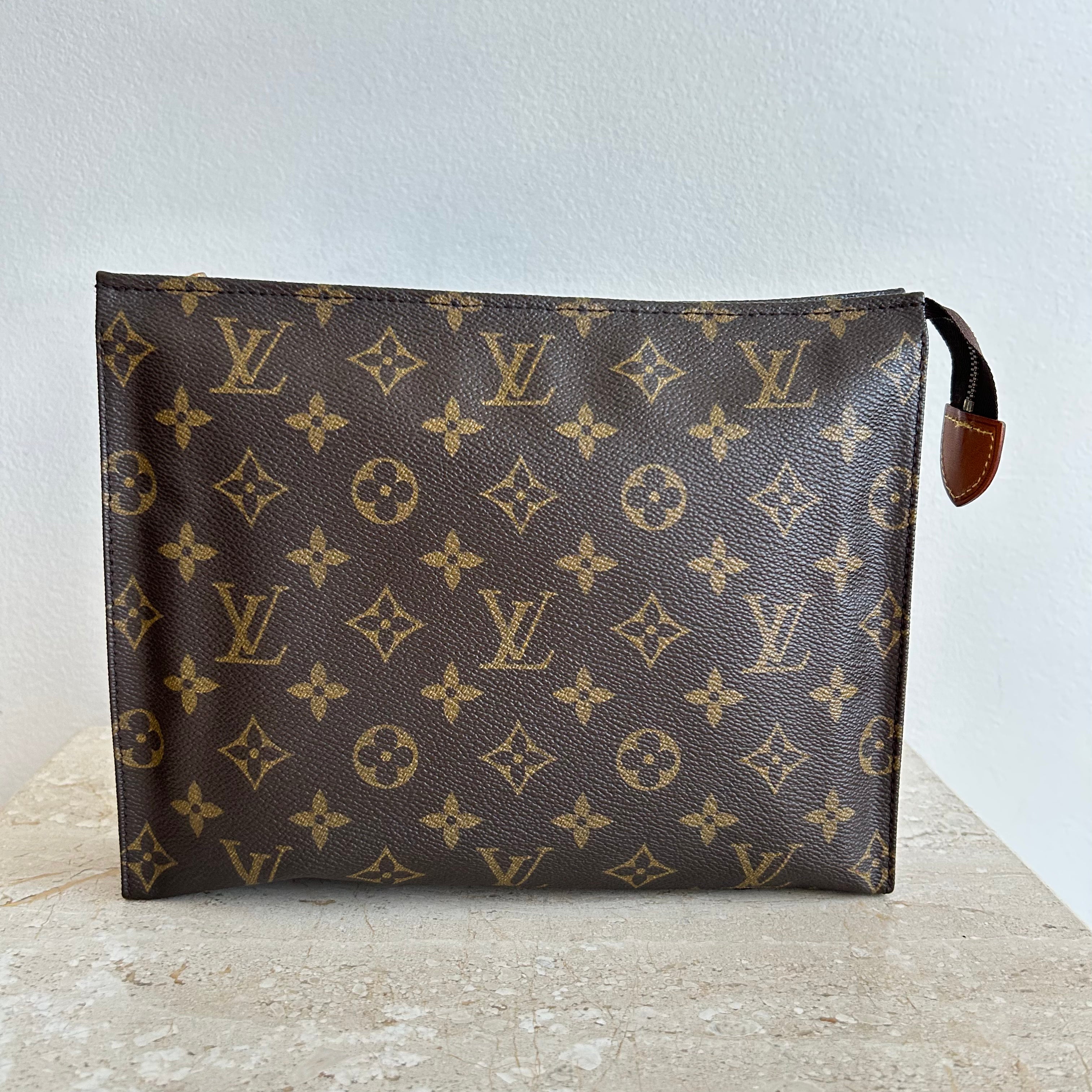 Pre-Owned Louis Vuitton Vintage Monogram Toiletry 26. Monogram coated canvas with cream leather interior. The perfect toiletry bag or use it like Princess Diana did at the beach, and wear it as a clutch! This model does not have the card slots - still sold as a toiletry bag at that point! A very versatile accessory.