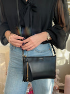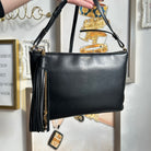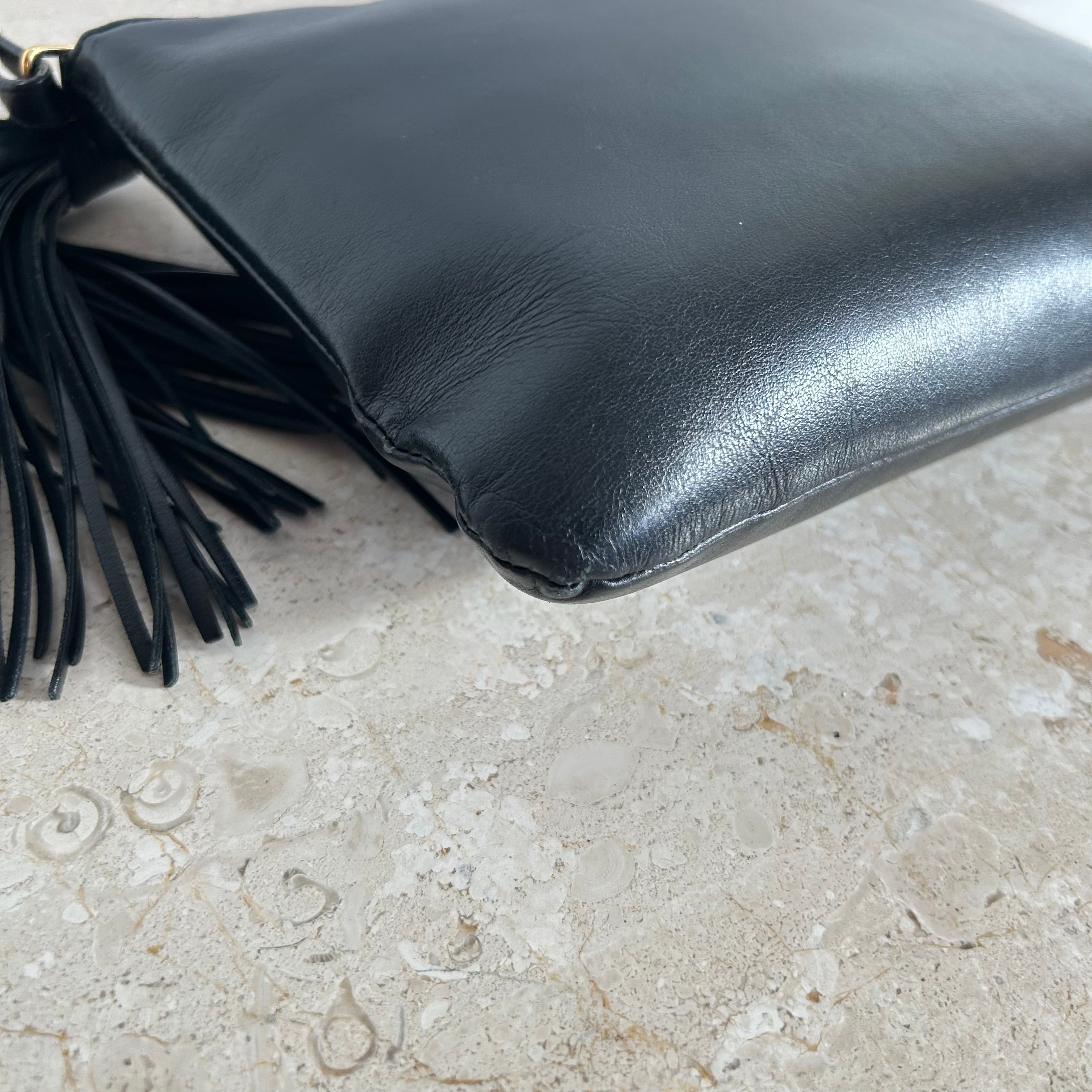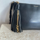 Pre-Owned Saint Laurent Black Leather Teen Monogram Crossbody Bag. Crafted in smooth black calfskin leather, with a tassel zipper pull featuring the youse monogram in gold tone. Matching black leather crossbody strap. Top zipper opens to a fabric lined interior hosting 2 slip pockets and 6 card slots. This is the perfect, chic crossbody bag!