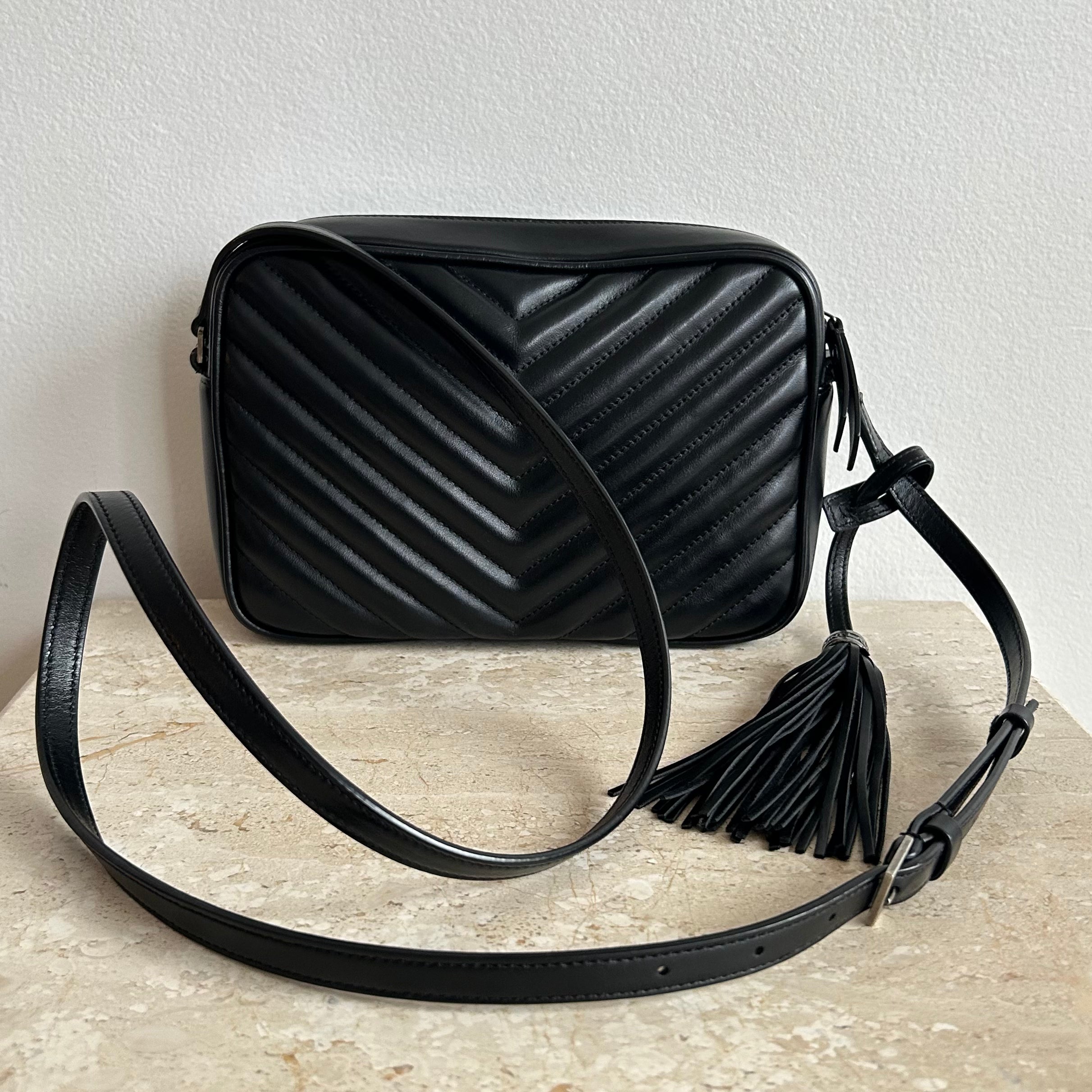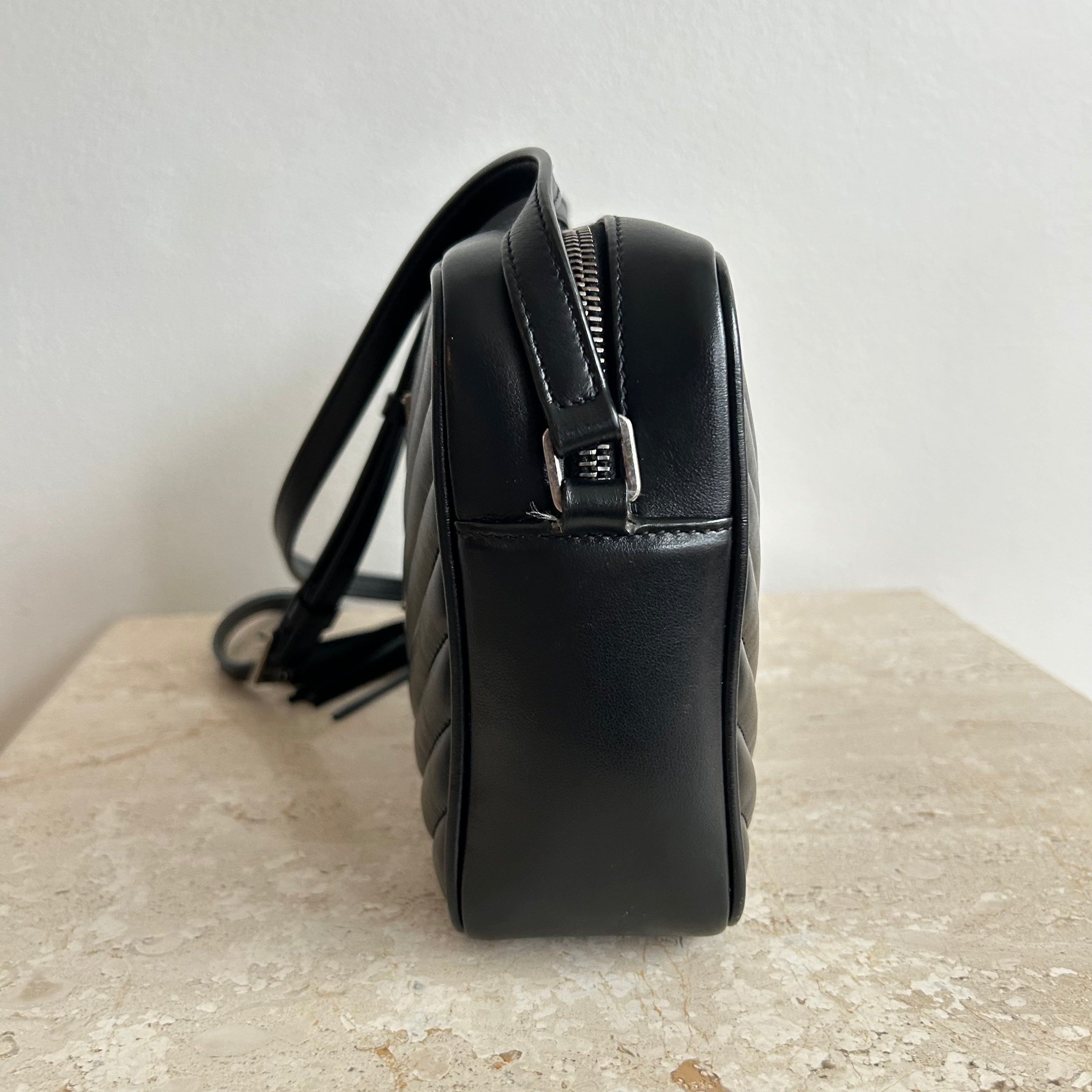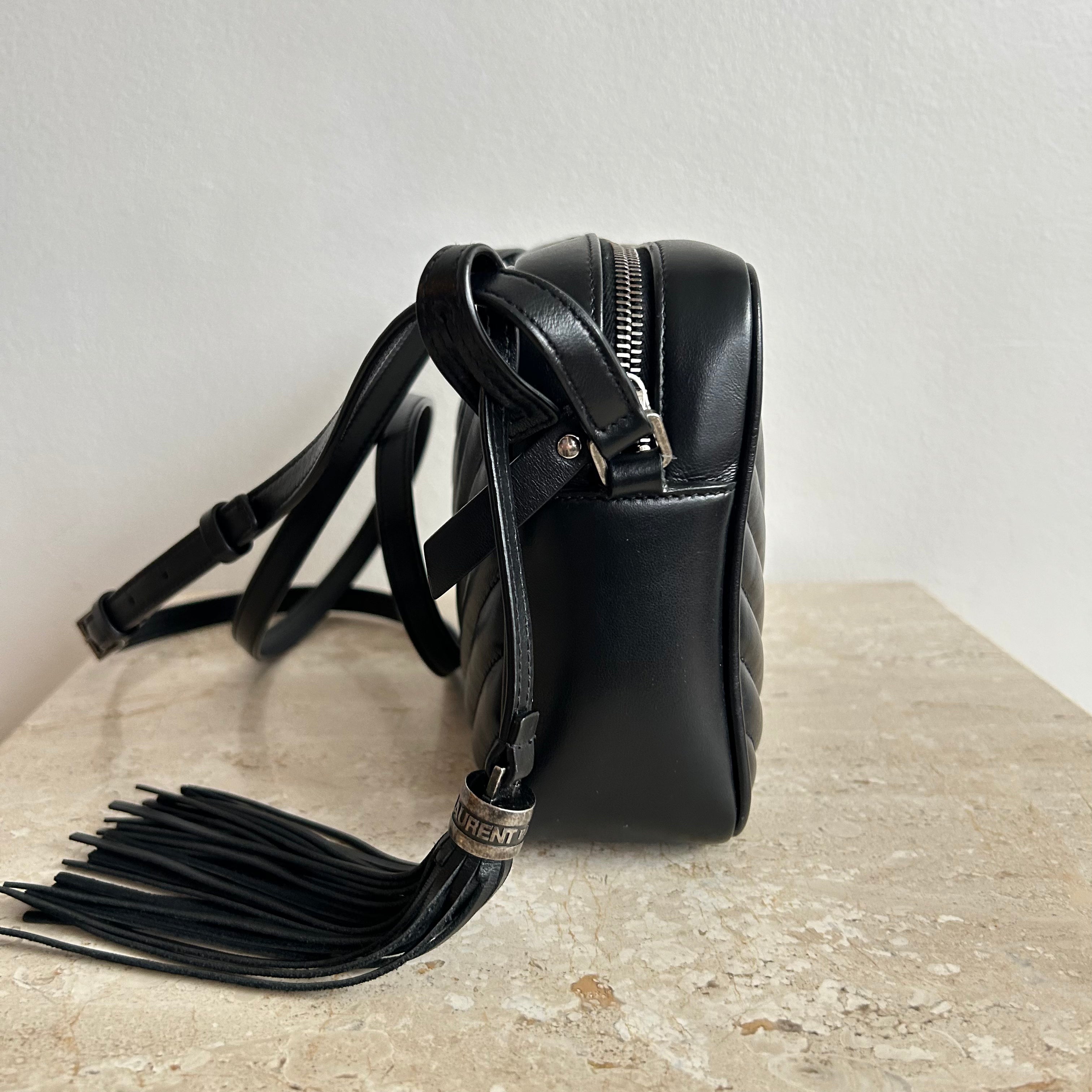 Pre-Owned Saint Laurent Lou Camera Bag. Beautiful and in a classic black, this is the ideal size crossbody bag. Perfect bag in all ways, from the silver toned full top zip, to the adjustable strap and adorned by a removable leather tassel. This bag opens up to one slit pocket and ample room for all your necessities and more! An exceptional find & perfect for travel!!!