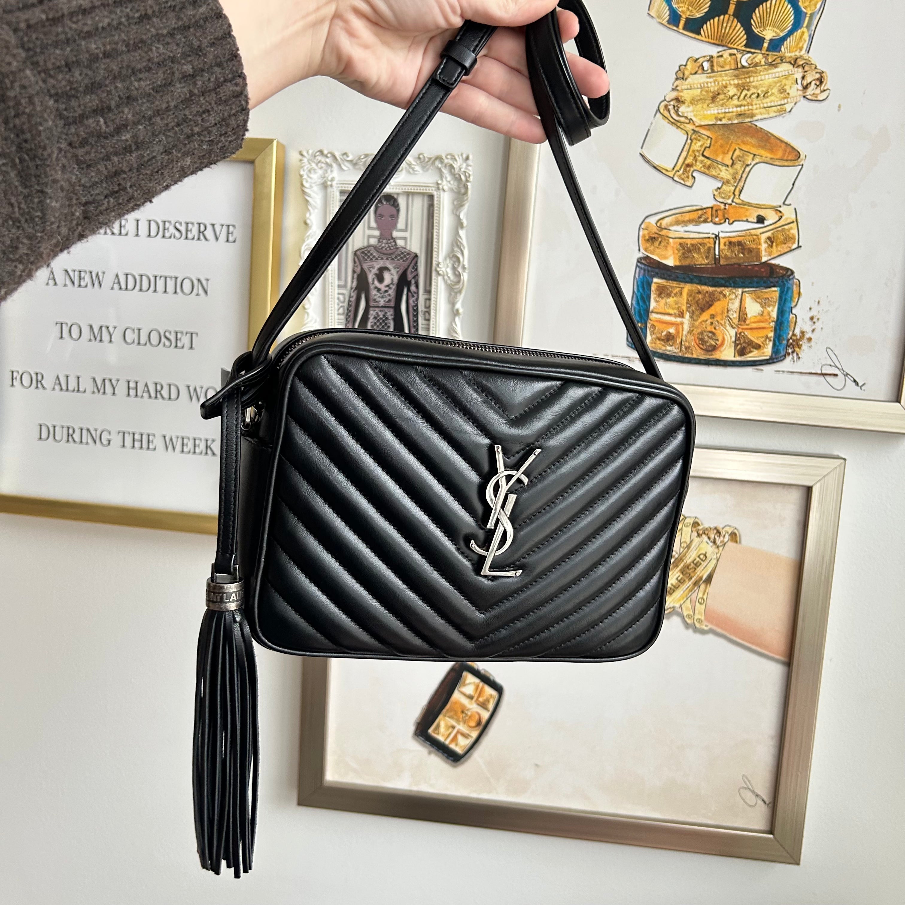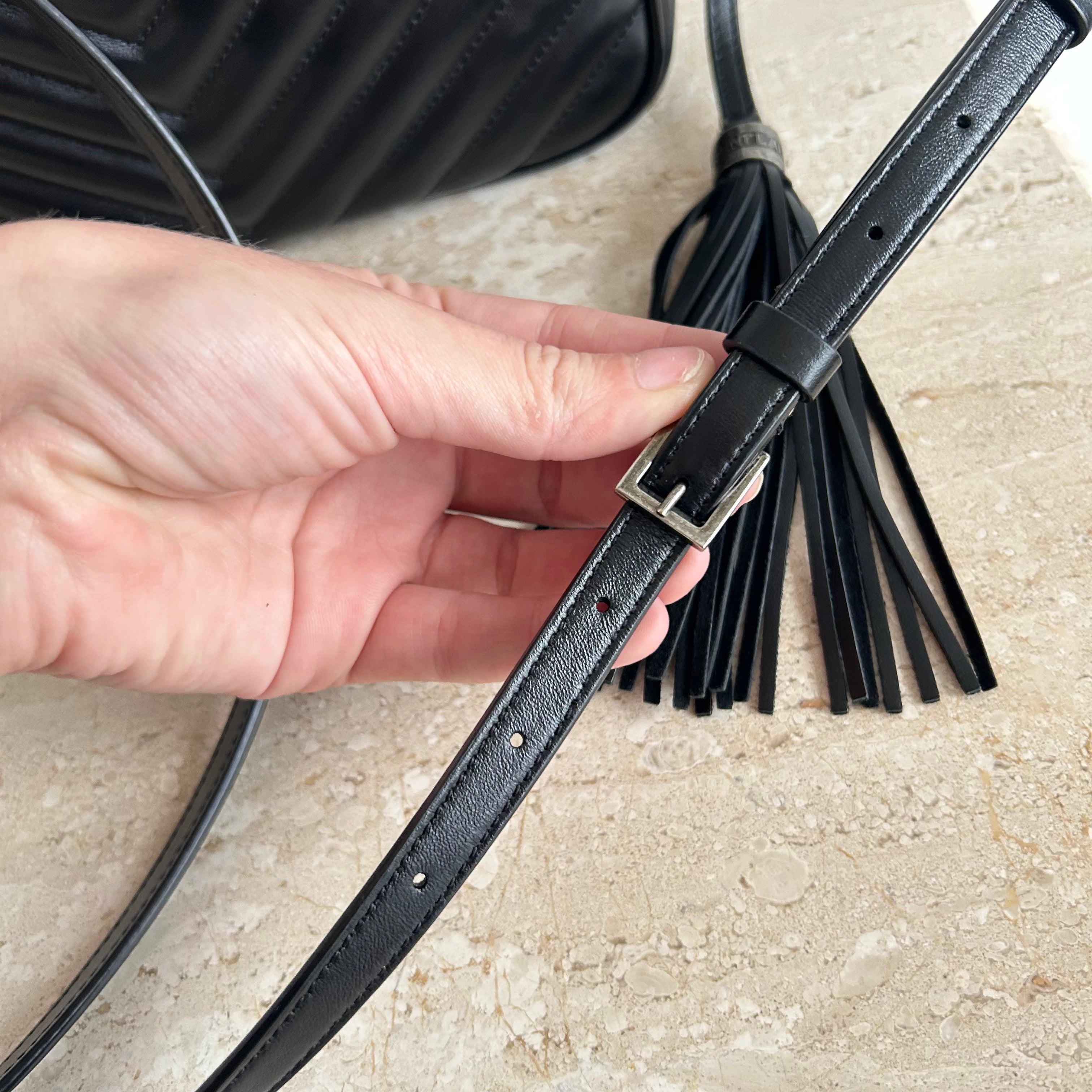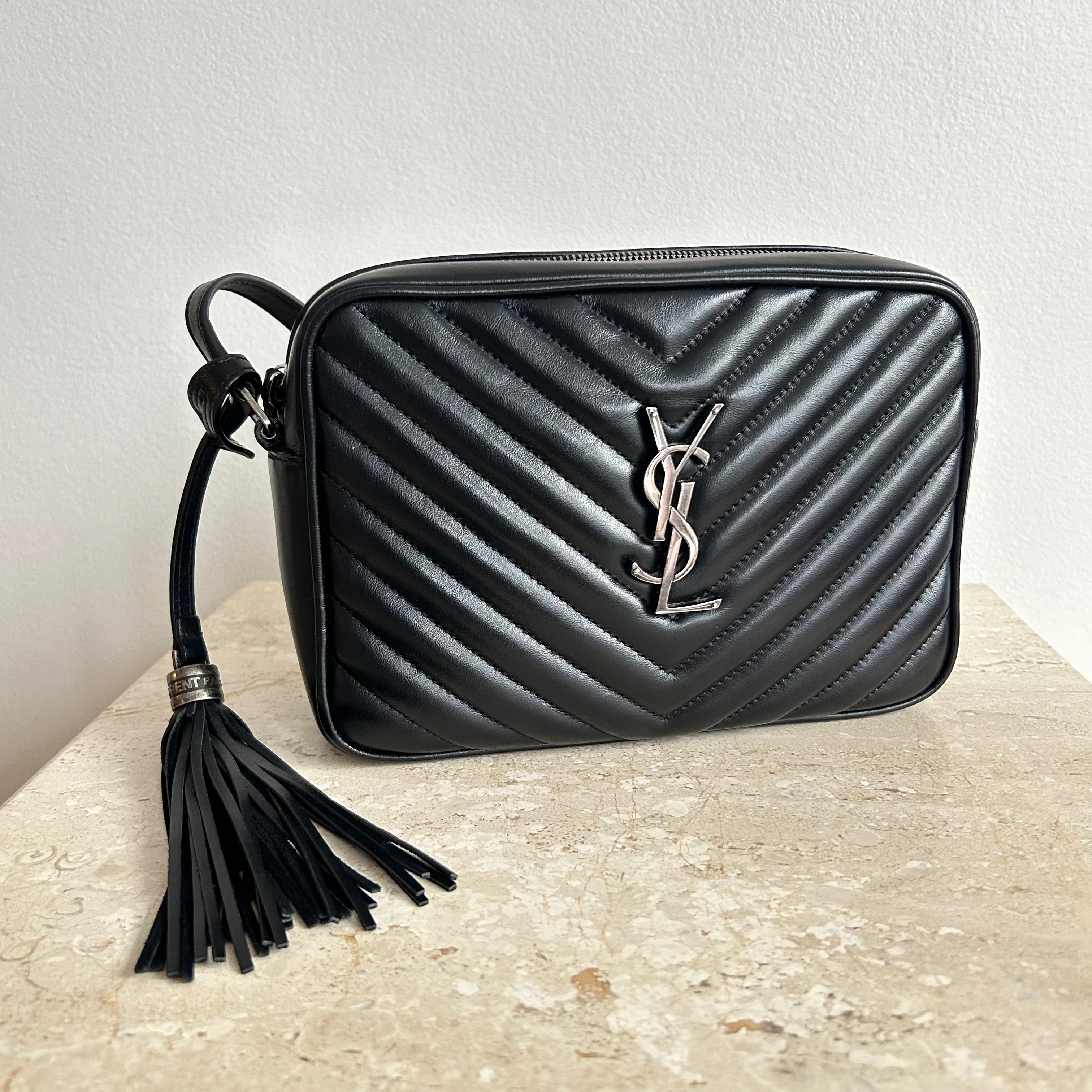 Pre-Owned Saint Laurent Lou Camera Bag. Beautiful and in a classic black, this is the ideal size crossbody bag. Perfect bag in all ways, from the silver toned full top zip, to the adjustable strap and adorned by a removable leather tassel. This bag opens up to one slit pocket and ample room for all your necessities and more! An exceptional find & perfect for travel!!!